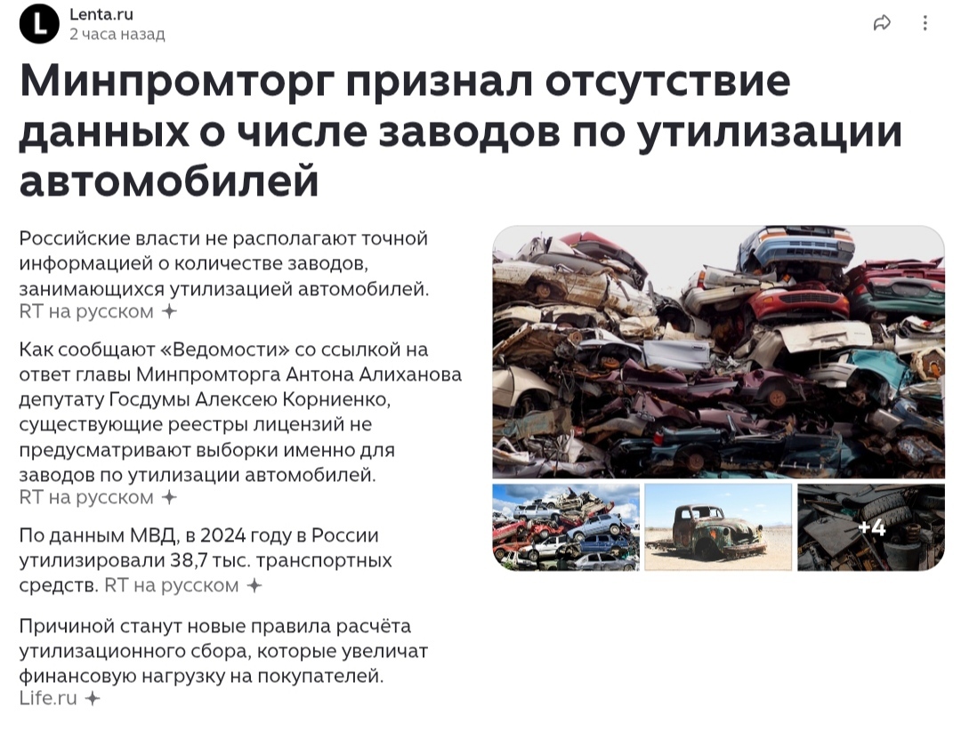 312 user9907339 Политика Продолжение поста «Профанация государства:»2 14 дней назад https://lenta.ru/news/2026/01/21/utilizirovali/ Государство Профанация Имитация Экология Утилизационный сбор Минпромторг Новости Картинка с текстом Ответ на пост Политика 92 6 4 3 2 Ещё 0
