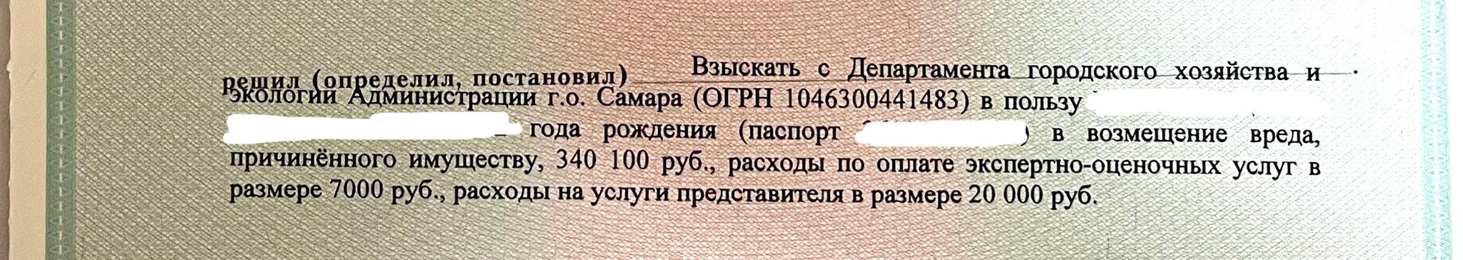Судья посмотрела запись с регистратора (даже вскрикнула от испуга), посмотрела мои красочные фотографии с места ДТП и встала на нашу сторону. Правда администрация скинула ответственность на департамент благоустройства, но нам это не важно. И вот результат: