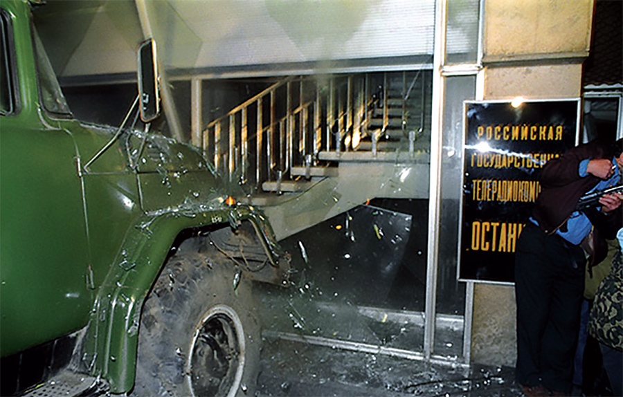 Сторонники Верховного Совета предприняли попытку проникнуть в здание, протаранив грузовиком стеклянные двери (сам Макашов не давал команды на таран дверей телецентра). Во время штурма раздалось два или три почти одновременных взрыва у пролома на месте дверей (осколками были ранены стоявшие рядом демонстранты), и одновременно внутри здания среди бойцов «Витязя» произошел взрыв неустановленного взрывного устройства, от которого погиб рядовой спецназа Николай Ситников.