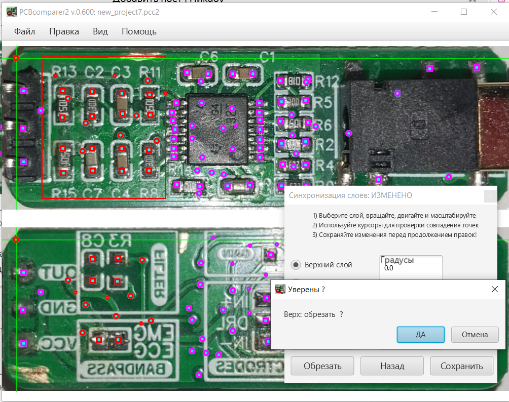 Редактор фотографий сторон печатной платы поможет синхронизировать обе фотки друг с другом: чтобы точка на одной стороне платы - более-менее точно совпадала с положением на другой стороне. Это вы сами визуально должны определить.