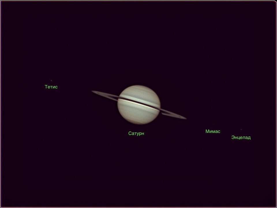 Изображение было улучшено моим добрым товарищем и наставником с целью немного увеличить яркость для того чтобы лучше показать спутники и paсказать ещё немного об удивительном мире Сатурна - шестой планеты от Солнца и второй по размеру после Юпитера. Его окружает система колец изо льда, пыли и камней, которые отлично видны в мой телескоп, видна даже щель Кассини. Ветер на его «поверхности» дует со скоростью до 1800 км/ч. А над северным полюсом шестиугольник из облаков. Это устойчивый вихрь, и он там уже не одну сотню лет. Несмотря на 120 000 км в диаметре, его плотность не высока, Сатурн так лёгок, что в гигантском водном океане он бы плавал. Вот такой Сатурн удивительный и интересный мир.