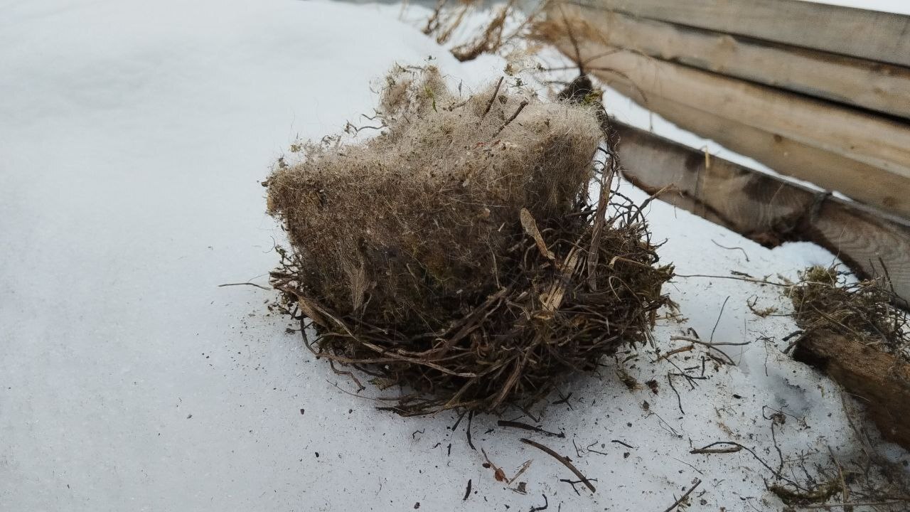 Очень плотно уложены стройматериалы, ветки и пух кажется какой-то.
