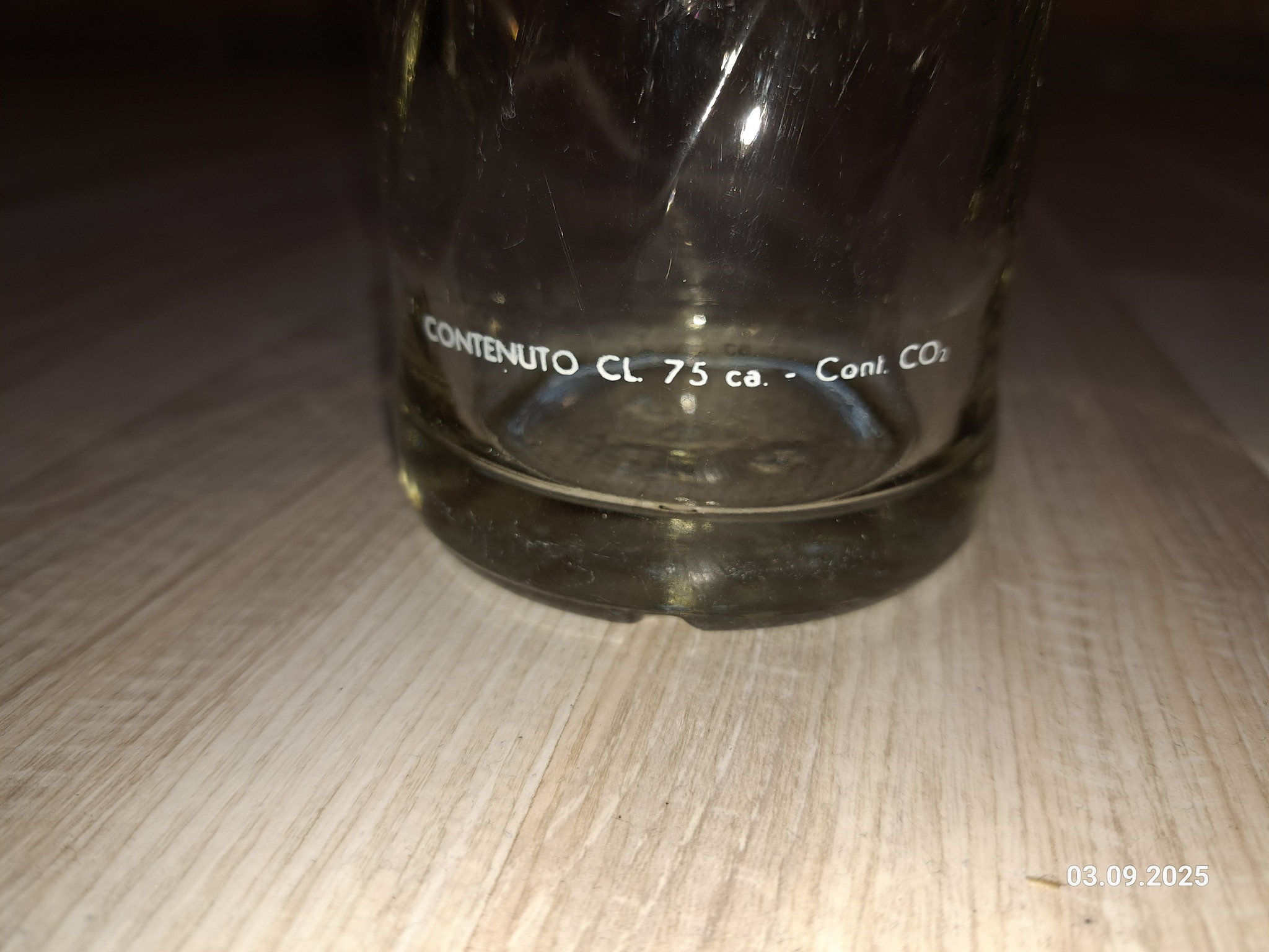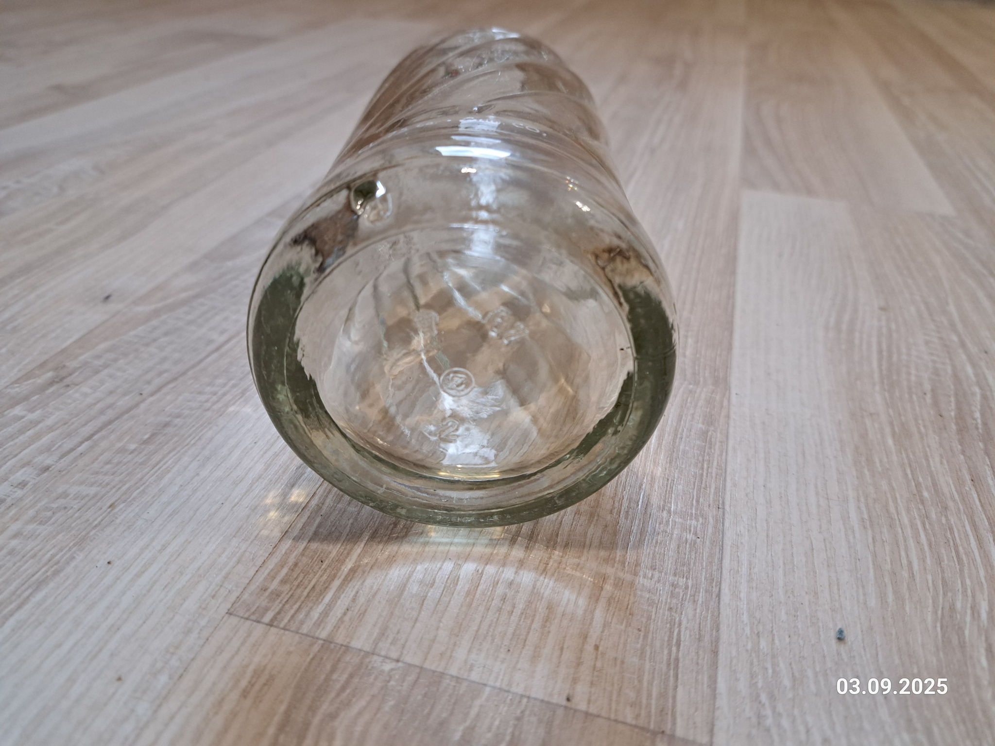 Добрался наконец до этой бутылочки через 2 года после того как я её нашёл и сфоткал. На удивление она так и пролежала на том же месте. Была она закрыта советской полиэтиленовой пробочкой. Открыл бутылку - в нос ударил аромат какого-то керосина или растворителя. Внутри плескалось немного какой-то жёлтой жидкости, видимо, остатки лака или разбавителя, а на стенках были остатки пожелтевшего и загустевшего лака или олифы. Принёс бутылку домой, вылил остатки жидкости, налил немного ацетона и - о чудо - ацетон сразу же смыл налёт и пожелтел. Вытер тряпочкой на палочке, снова промыл ацетоном, потом водой - и вот перед нами чистая раритетная бутылка: