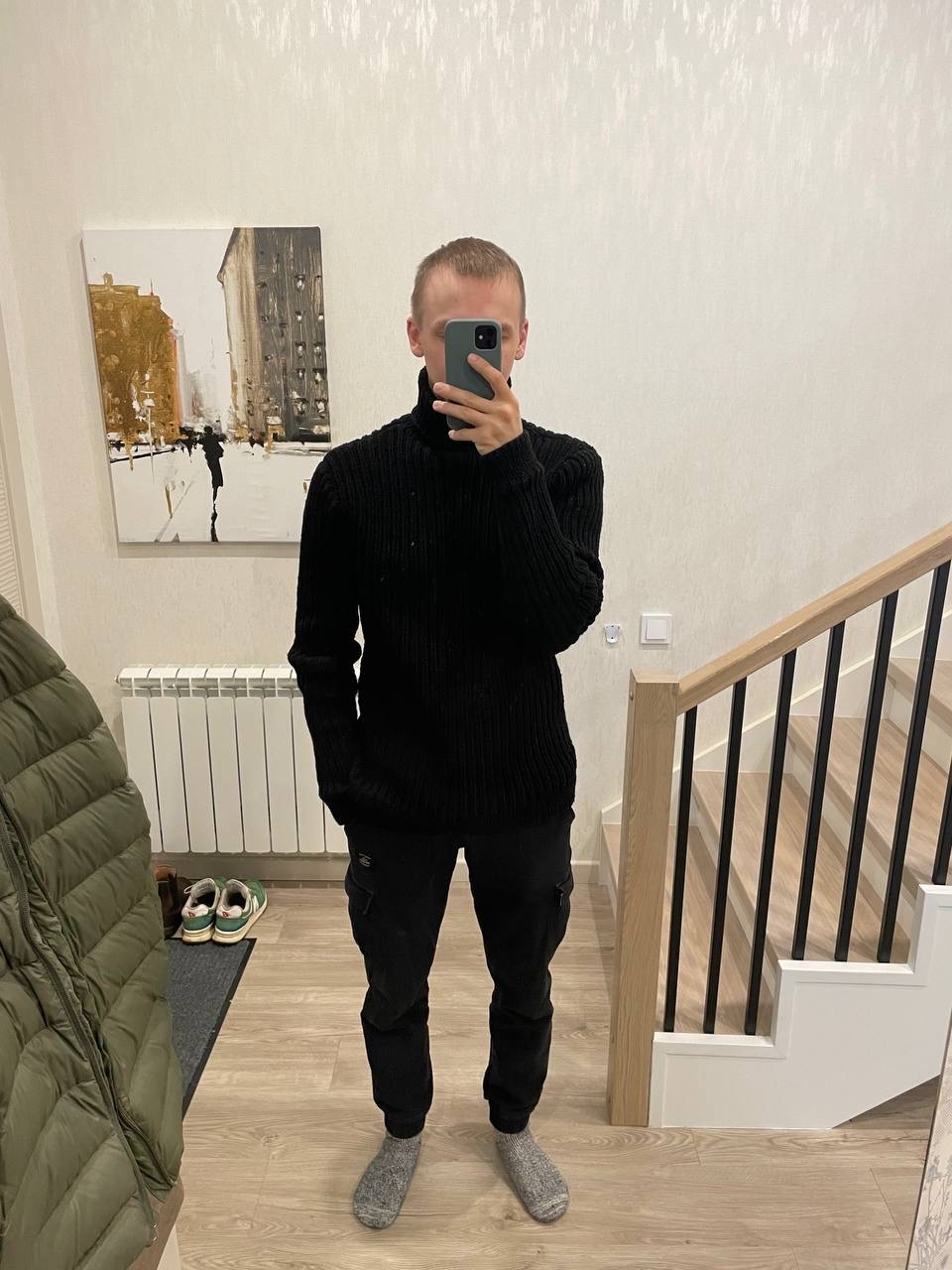 Вяжу ещё один такой свитер, светло-серого цвета, но в 58 размере. Работы - не початый край! Договорились, что он позволит мне отфотографировать примерку самой 🌝