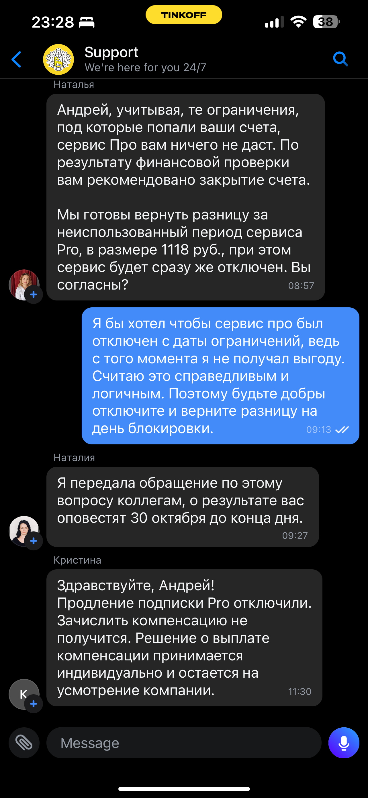 @T.Bank, это как понимать, помимо того, что проценты по вкладам вы хотите присвоить, присвоить мой кэшбек, так теперь ещё оплату ПРО вы тоже себе присвоили уже??? Вы точно банк, а не ребята в балаклавах, но не те, что с удостоверениями??? У меня была оплачена на 1 год подписка, Вы мне должны вернуть за 7 месяцев, это приблизительно 1200 рублей! Да, деньги не бог весть какие, но это же просто зашквар для банка их себе прикарманивать! Вы в своём там уме??? Пускай народ посмотрит, в какую помойку вы скатились, это просто днище уже. Вчера ещё думал мы дне, а нет, сегодня спустились ещё на уровень ниже. Дальше что? Боюсь даже предполагать. Отдайте мне уже просто мои деньги от греха подальше! А с вопросами процентов, кэшбеков и теперь ещё возврата за подписку ПРО - давайте отдельно решать! Отдайте мои деньги, повторяю!!! Отдайте!!!