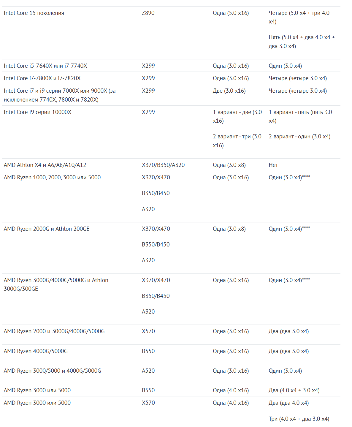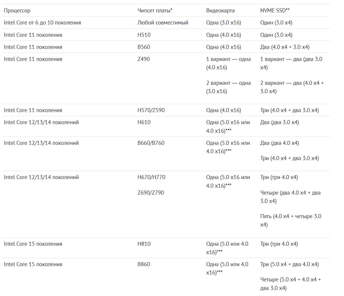 * - учитываются максимальные возможности чипсета. На некоторых материнских платах могут быть реализованы не все линии и слоты, позволяющие добиться такой конфигурации устройств.