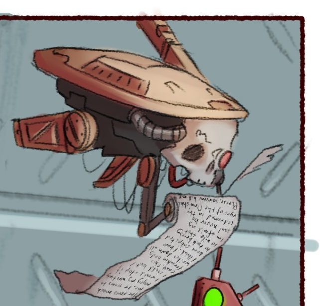 "Я был подвергнут такой ереси, что боюсь, моя душа никогда получит искупления в глазах Омниссии. Пожалуйста, кто-нибудь убейте меня." Текст на свитке