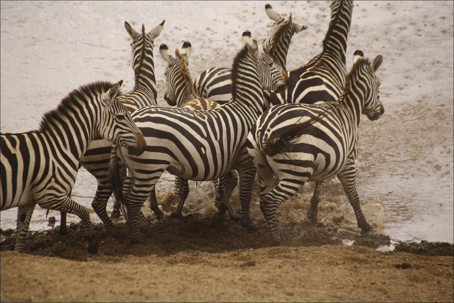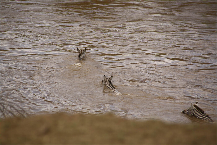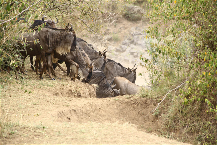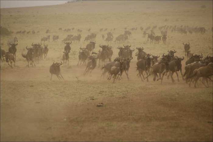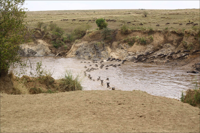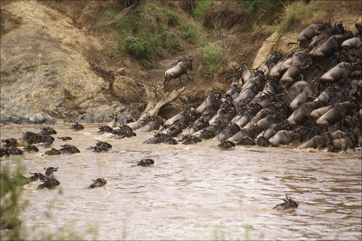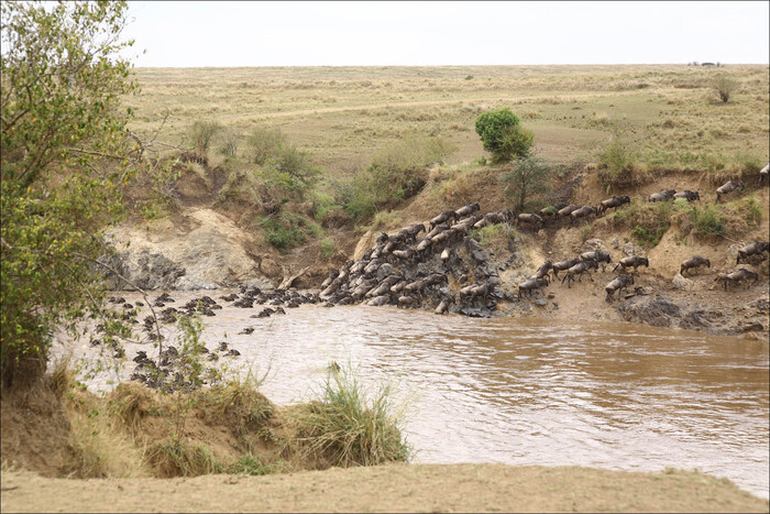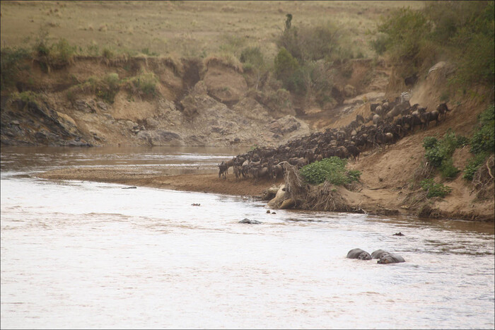 И пошли через реку. Для нормальных людей это просто стадо до горизонта, но вообще это одно из самых впечатляющих зрелищ на планете. Дуглас-Гамильтон писал про большую миграцию так: «Большинство присутствующих ученых разделяли это чувство, и они наблюдали за миграцией гну с тем же почтительным восхищением, с каким созерцают «Джоконду».