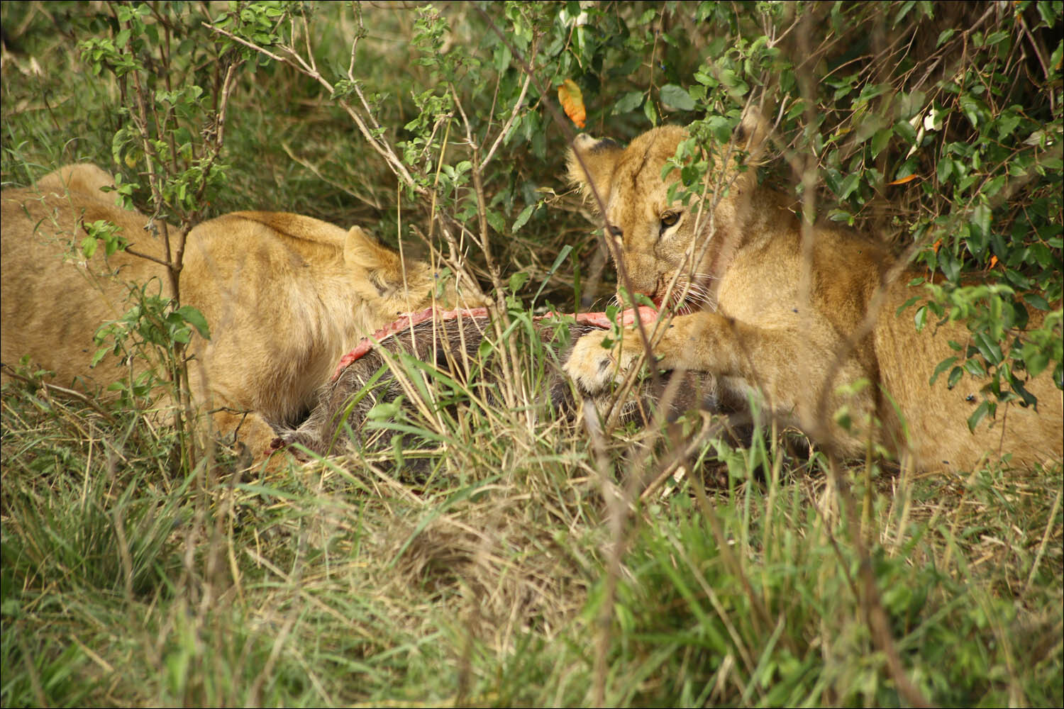 «Много или мало этих больших желтых кошек находится в той или иной местности, зависит, впрочем, не только от числа животных, которыми они питаются, а также… от высоты травы. Мы заметили, что в Серенгети стада гну, зебр и газелей Томсона, когда у них появляется молодняк, обязательно откочевывают в места, где трава низкая. В такой траве лев не может спрятаться.»
