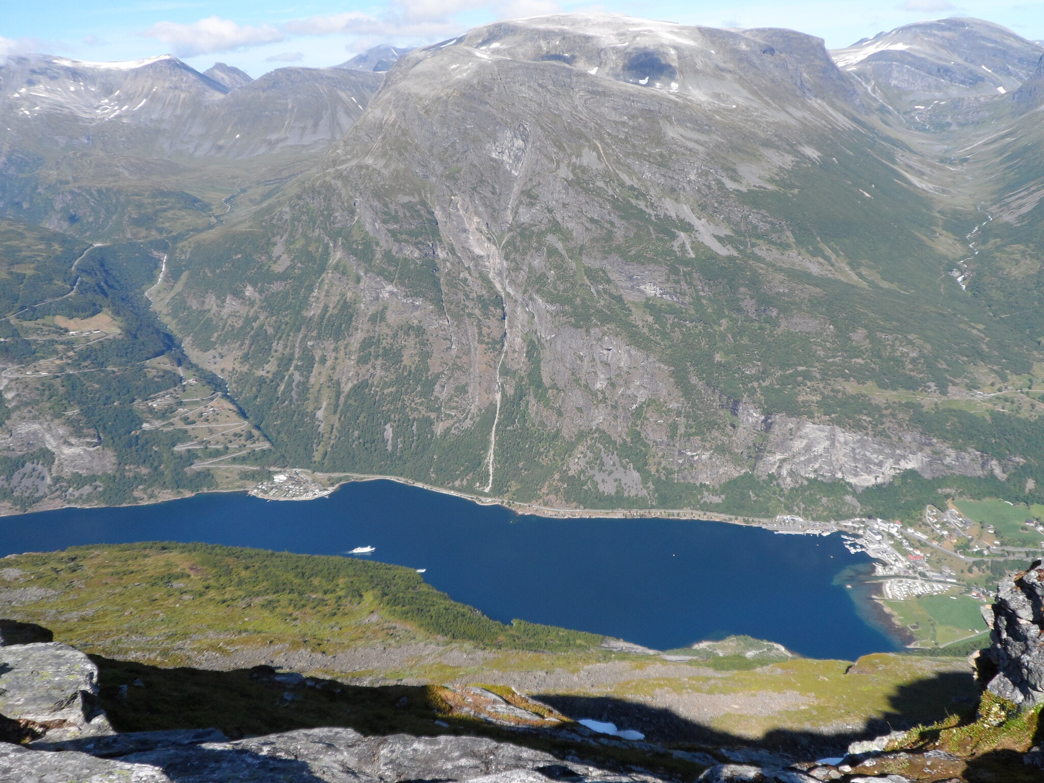 Что сказать? Виды - безумно красивые. Даже для тех туристов, кто приплыл на огромных круизных лайнерах, но глядя на ущелья с почти облачных высот, открывалась полная версия природного шедевра. Лежащий местами снег, зеркало горных озёр, поросшие мхом и травой домики пастухов, величественные водопады, стекающие брызгами в теснину фьорда, кутающиеся в облаках скалы и серпантины. Дух захватывает. Фотографии (неважно, будь они лучше по качеству) не передают и толику величия этих мест.