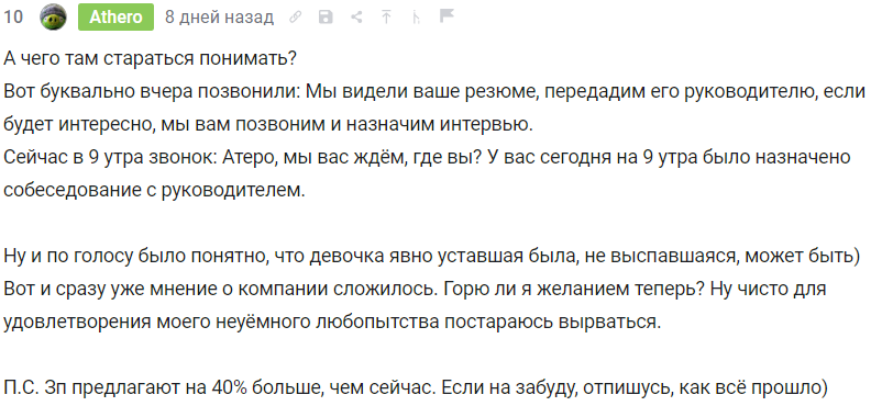 Так вот, я посетил этот собес. Это была та самая организация, на которую я в прошлом году (РОВНО год назад) потратил своё время, как в моём посте. И... у них там не изменилось ровно ничего. Ищут того же специалиста. Также желают видеть меня там. Девочка-HR также гордо обещала и ДМСы всякие, и зп выше, чем сейчас, да-да, только приходи...