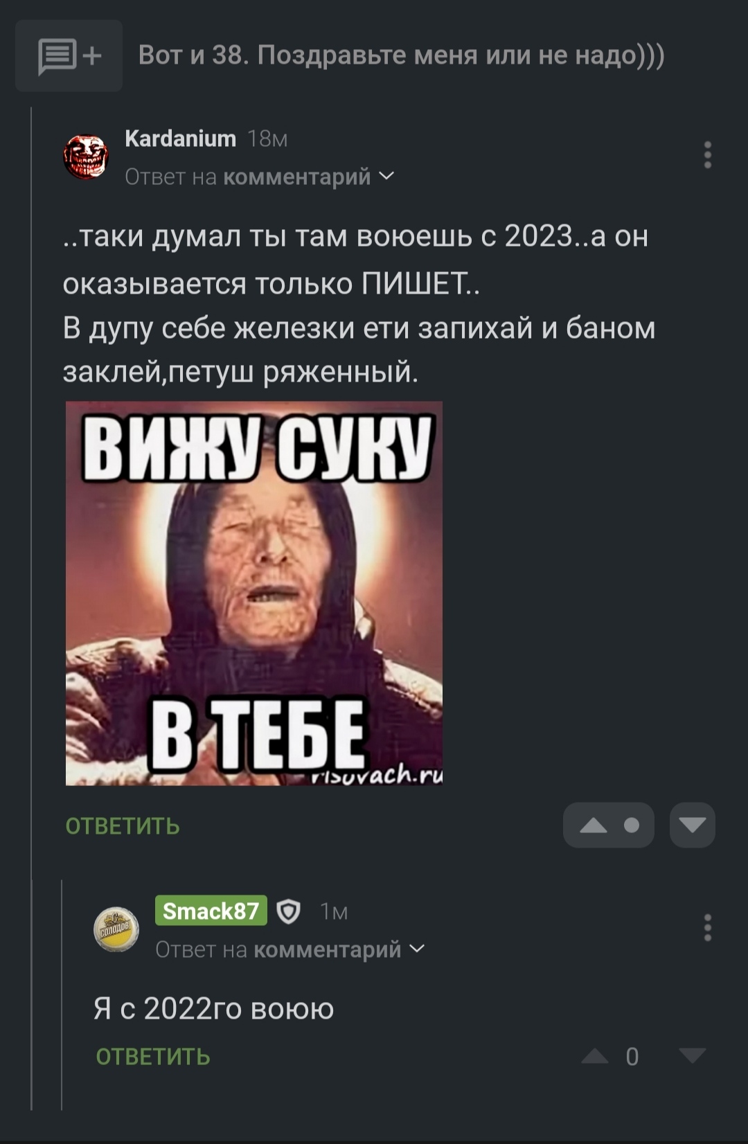 Я с 23го года иногда пишу по теме СВО, но очень редко. Там многие подробности моей жизни есть. Для человека с тремя ранениями, лишившегося пальцев (не на жалость давлю, просто тоже выкладывал про это - так себе пруфы, да?) и который четвертый год воюет - ну обидно на таких людей попадать. Настроение праздничное подпортил немного, ну и заминусили пост и комменты, переживу.