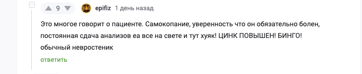 Это многое говорит о пациенте. Самокопание, уверенность что он обязательно болен, постоянная сдача анализов еа все на свете и тут хуяк! ЦИНК ПОВЫШЕН! БИНГО! обычный невростеник