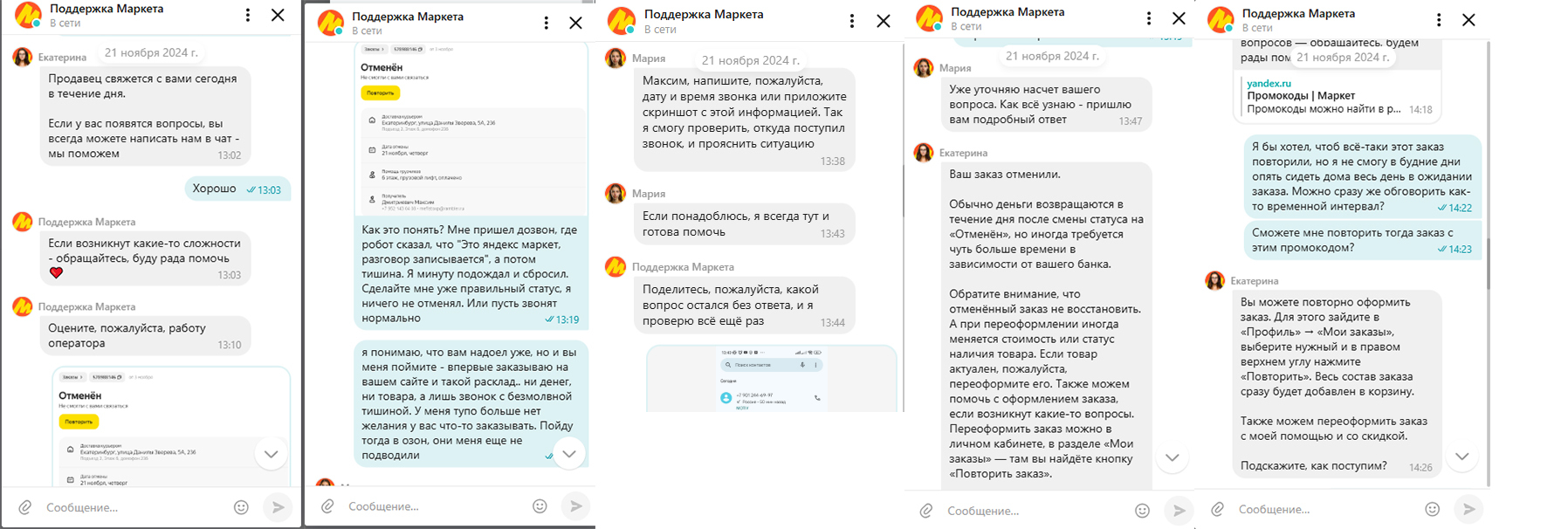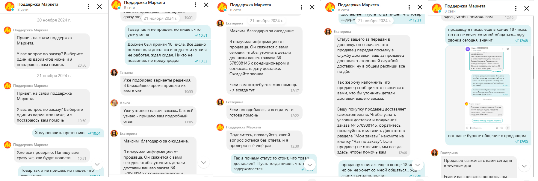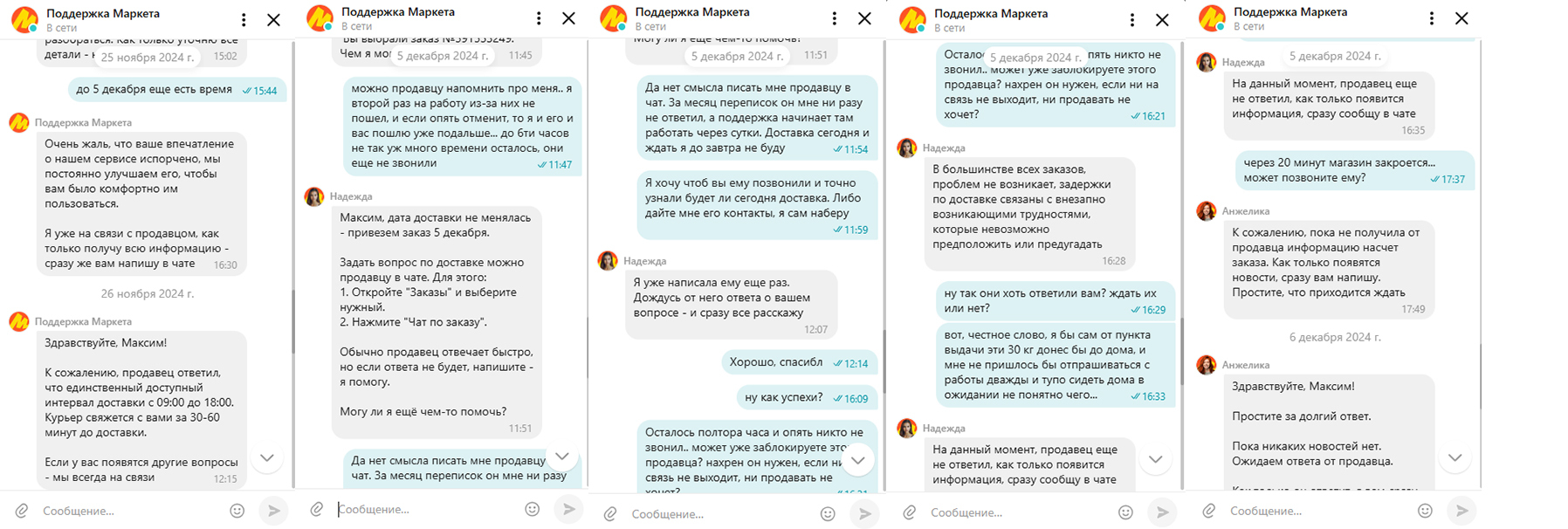 Странно, но у них сбой по техническим причинам.. Сам повторил заказ, но хочу всё-таки время уточнить. Как видите, 21 числа написал в чат с продавцом, 22 написали, что он не ответил, включилась в вопрос Яндекс поддержка. И вот уже 25ое - никто не ответил. В тех поддержке, оказывается, даже и не знают, что я чего-то от них жду и предлагают все манипуляции повторить.