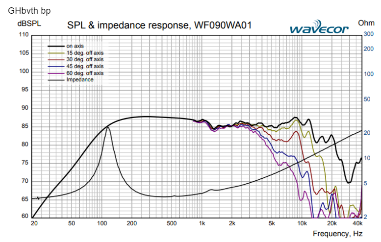 Пример из спецификации динамика Wavecor: как видите, при осевом измерении “полка” АЧХ простирается до 12 кГц. А вот при отклонении от оси на 45 градусов, этот динамик явно не хочет звучать выше 3.5 кГц. Разница существенная.