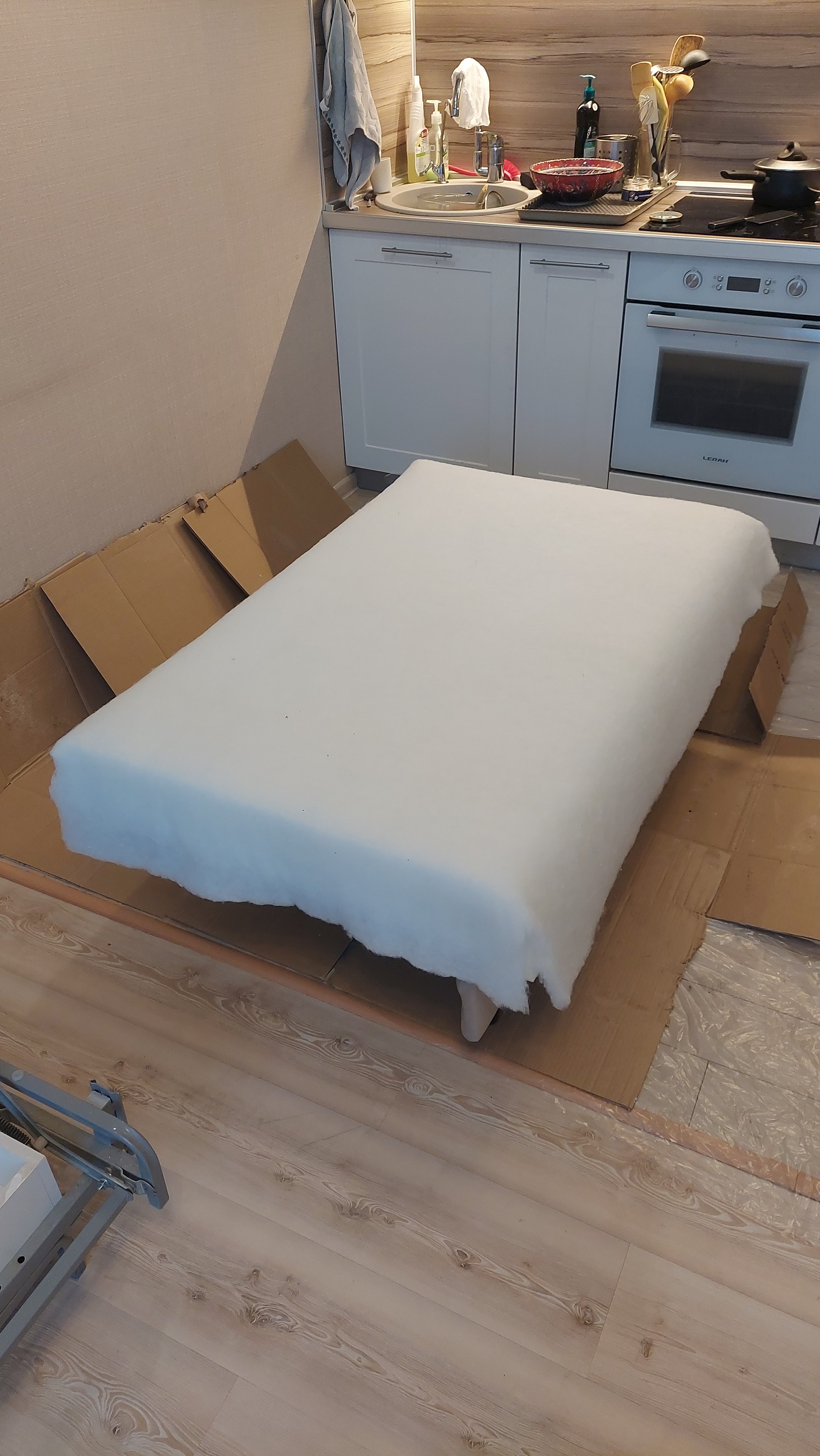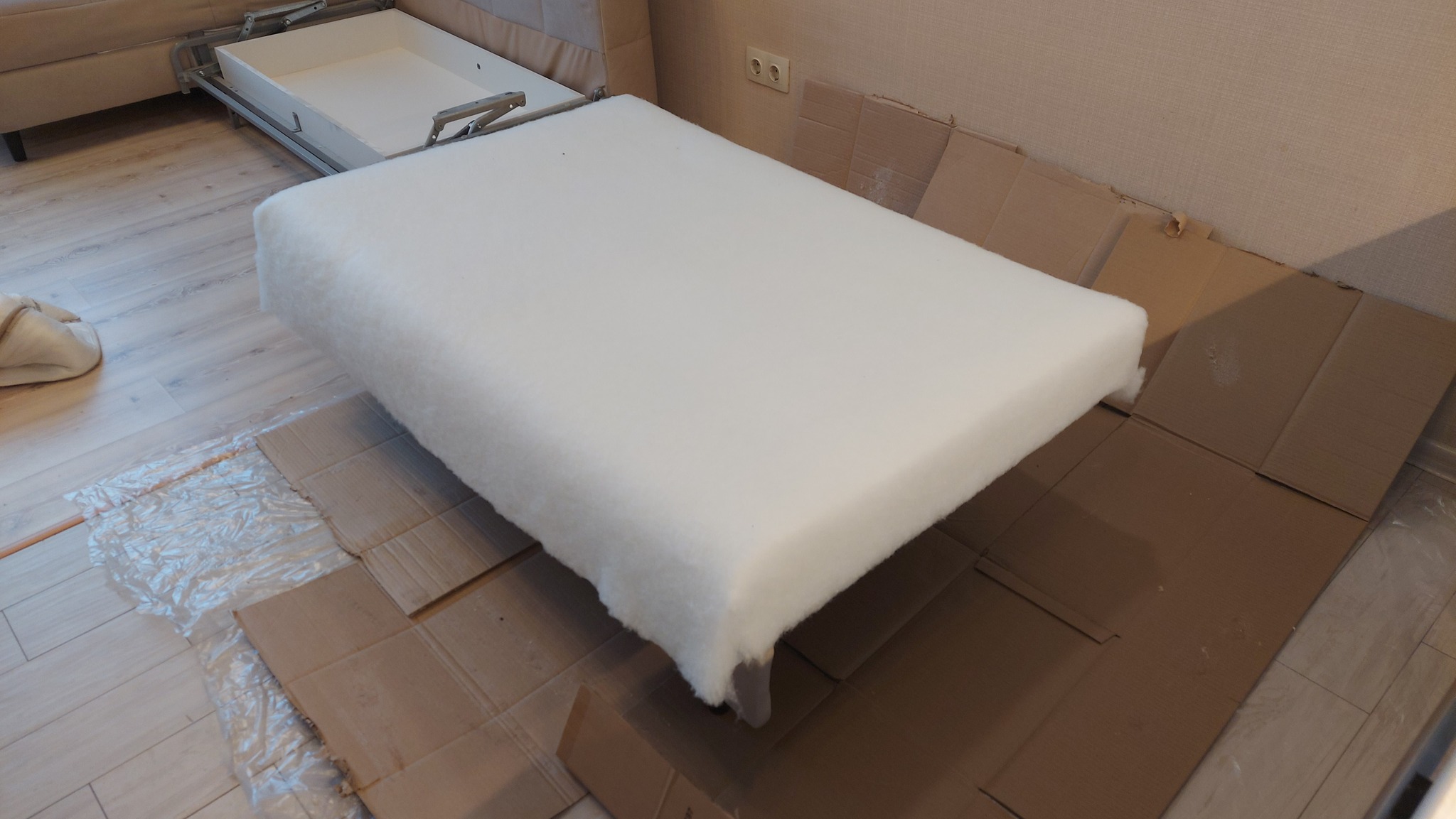 Далее замер и раскрой листов ППУ, наклейка ленты для предотвращения смещения подушки на каркасе, склейка листов между собой...