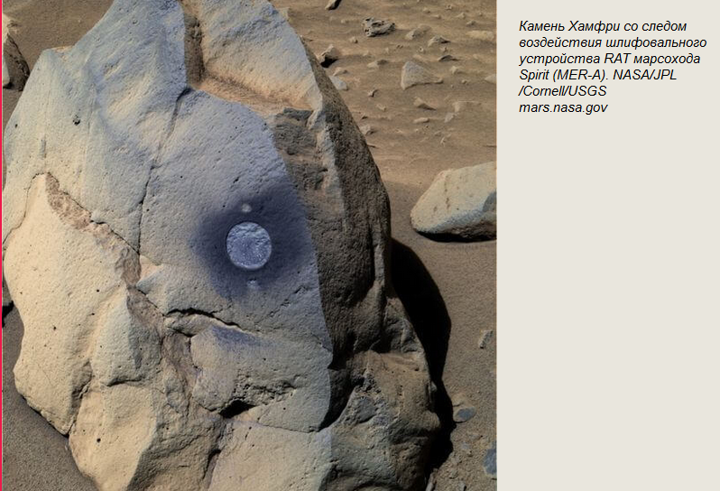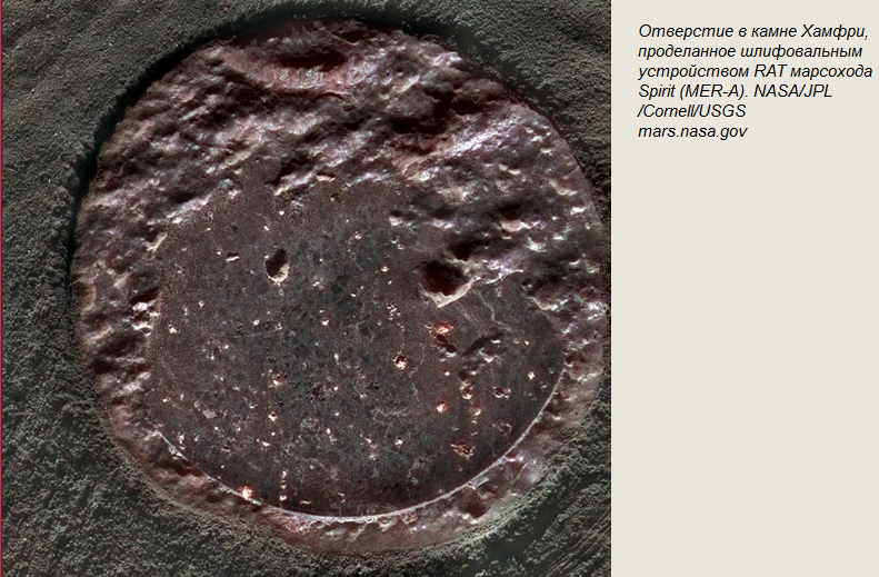 По дороге, в начале марта, «Спирит» исследовал камень Хамфри (Humphrey): сначала проспектрометрировал его «как есть», затем высверлил RAT отверстие глубиной 2 мм и ввёл туда один спектрометр за другим. В тёмном камне удалось обнаружить следы воздействия воды: в его внутренних полостях и трещинах виднелся яркий материал, похожий на отложения соли. На пресс-конференции доктор Рэй Арвидсон из Вашингтонского университета в Сент-Луисе, заместитель научного руководителя миссии, заявил: