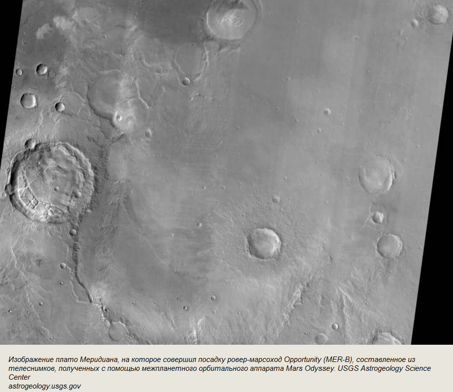 Межпланетная посадочная станция MER-B вошла в атмосферу Марса 25 января 2004 года и совершила посадку в точке с координатами 1°57' ю.ш. и 354°28′ в.д. Первые же картинки, полученные с борта, показали: плато Меридиана (Meridiani Planum), где предстояло работать «Оппортьюнити», не похоже ни на что, виденное ранее в Солнечной системе. Перед учёными предстала ровная поверхность, на которой совсем не было камней, но кое-где вместо них присутствовали обнажения породы, напоминающие древнюю плитку или кости динозавра. Кроме того, хорошо были различимы отпечатки, оставленные подушками-амортизаторами, а в десятке метров находился высокий вал. Потрясённый Стив Сквайрс высказал догадку, что станция угодила в кратер.