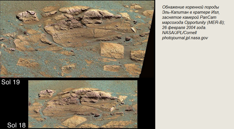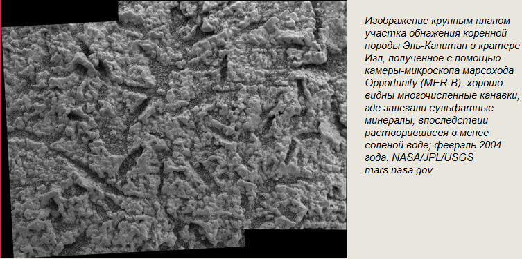 Обычная и микроскопическая съёмка обнажения Эль-Капитан выявила на нём три вида деталей, которые рассказывают о «водной истории». Первый вид — извилистые канавки длиной порядка 10 мм и шириной до 2 мм со случайной ориентацией — на их месте первоначально залегали сульфатные минералы, впоследствии растворившиеся в менее соленой воде. Второй вид — слои, которые лежат под углом к основной породе и обычно возникают под действием ветра или воды; их малые размеры и вогнутые формы говорят в пользу именно водного происхождения. Третий вид — постоянно попадающиеся округлые частицы («сферулы», «шарики»), не связанные с какими-то определённым слоем, а потому вряд ли появившиеся в результате метеоритного удара или извержения вулкана. Приходится признать, что это конкреции, которые возникли в растворе вокруг «центров роста».