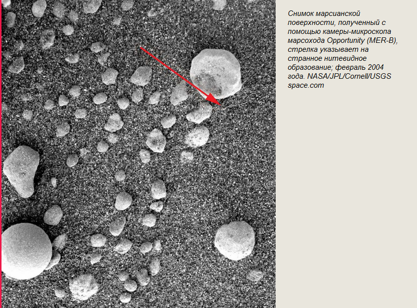 «Марсианские сыщики» с энтузиазмом принялись изучать новые снимки. Они выявили тончайшие образования, заснятые микроскопом «Оппортьюнити» и напоминающие волосы. На прямой вопрос журналистов, что это такое, Стивен Сквайрс заявил, что, вероятнее всего, замеченные нити — волокна с подушек-амортизаторов. При этом он добавил, что мнение, будто бы нити занесены марсоходом, — лишь одна из гипотез. «Оппортьюнити» будет искать похожие образования в других местах и если найдёт, то первоначальную гипотезу придётся отбросить.