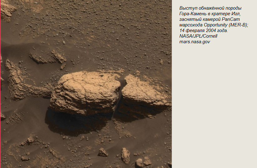 Утром 5 февраля, в 12-й сол, «Оппортьюнити» двинулся в направлении правого конца обнажённой породы. 8 февраля он добрался до выступа, названного Гора-Камень (Stone Mountain), изучил его через микроскоп и «обнюхал» спектрометрами. И опять удивительное открытие: небольшие сферические образования, выступающие между слоями камня («как изюм в булке») и разбросанные вблизи него на грунте. Вероятно, они оказались на поверхности в результате выветривания.