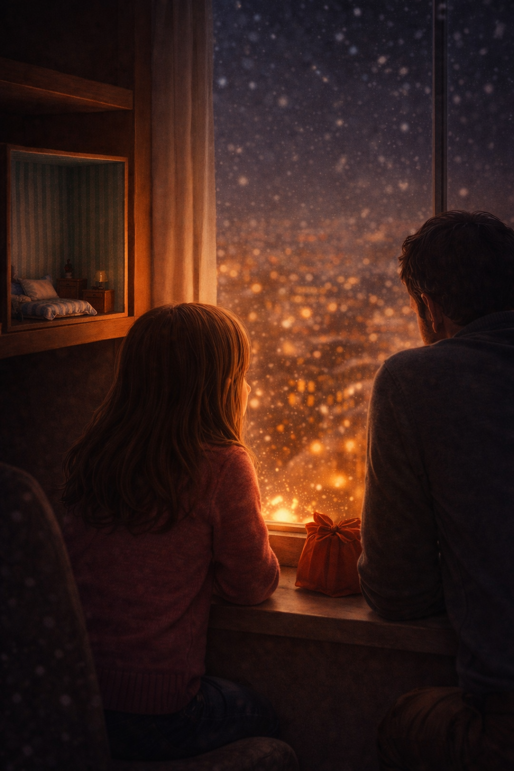 Вечером, когда за окном загорелись новогодние огни, лисёнок снова стоял на знакомой полке. Рядом с ним Алёна поставила маленькую веточку ели с подвешенной шишкой - подарок от лесных жителей, как ей показалось.