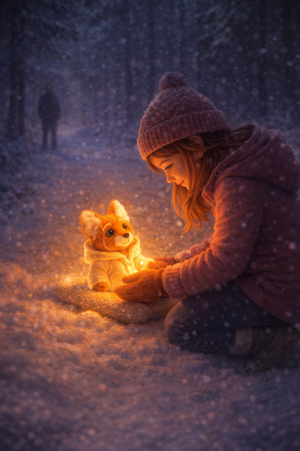 Чем ближе она подходила, тем отчётливее видела знакомую меховую варежку. А на варежке, освещённый изнутри тёплым светом, сидел её лисёнок с капюшоном, натянутым на ушки.