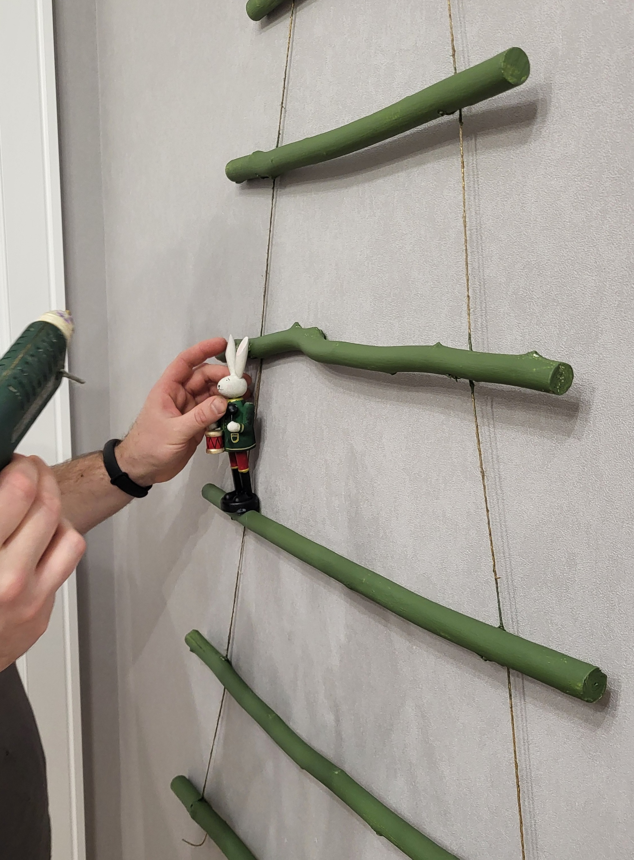 И дабы не пропадать добру, решили их разместить на ёлку. Но белая уже была ни к чему, поэтому начали с перекраски чем было. А была зелёная краска в очень красивом оттенке. Удачненько.