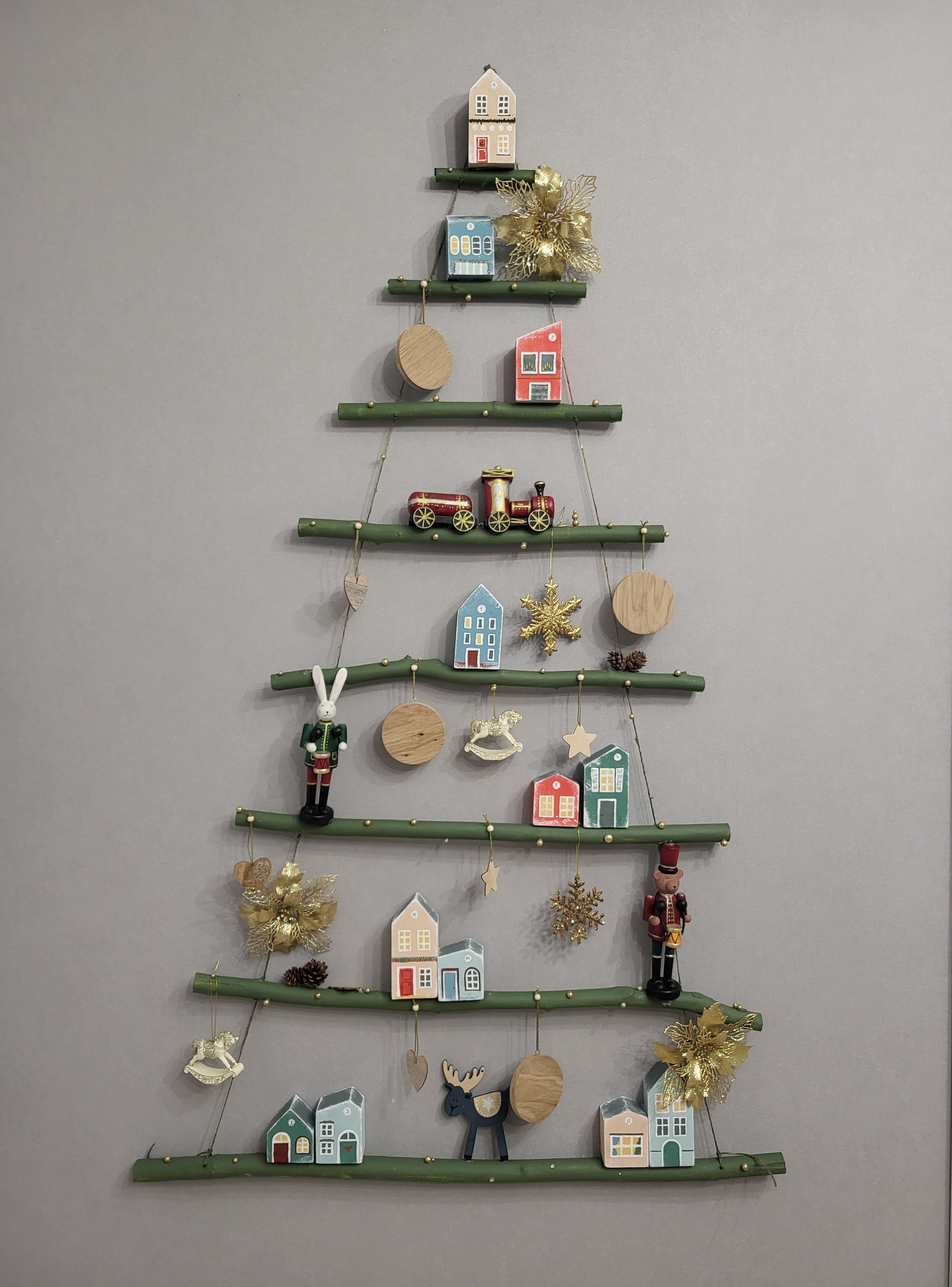 Хотелось поддержать рукотворно-деревянную тематику, нашли на дне коробки с игрушками деревянные домики от первого адвента старшего (когда-то давно напилили доску и разукрасили), какие-то штучные игрушки, подаренные в разное время, муж принёс из мастерской дубовые кружочки - обрезки производства. Всё это приклеили термоклеем.