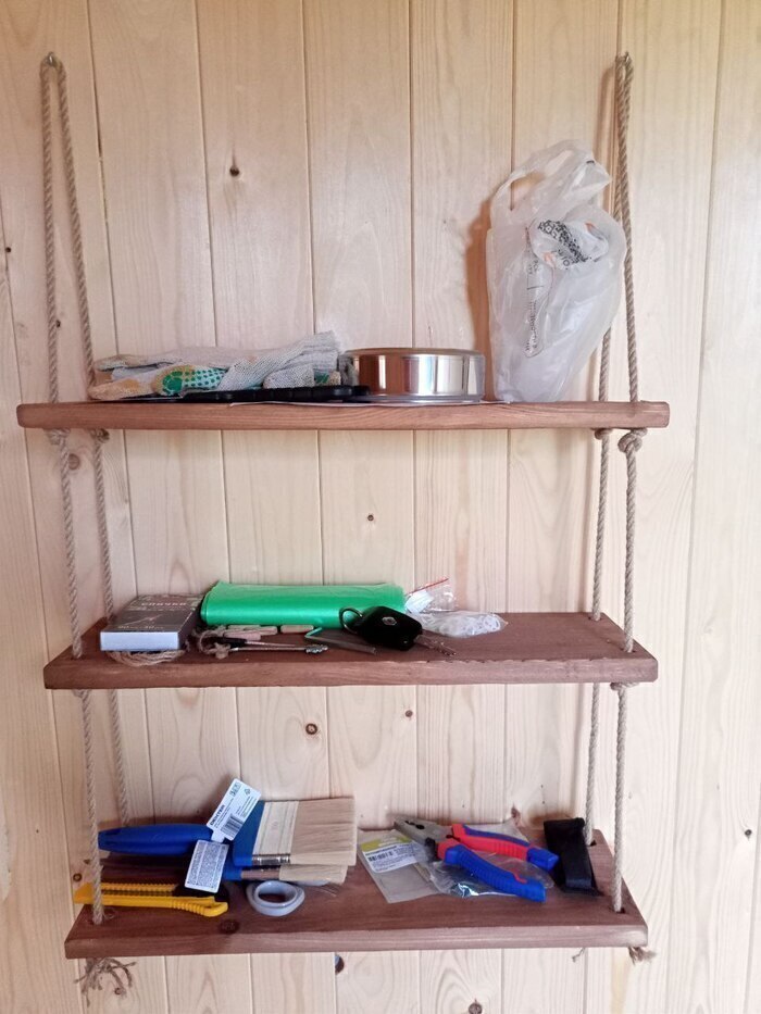 Крепятся они на джутовые верёвки соответственно. Далее - куда девать барахло? Вся мелочь размещается вот на таких полках, также крепящихся на джутовой вкревке.