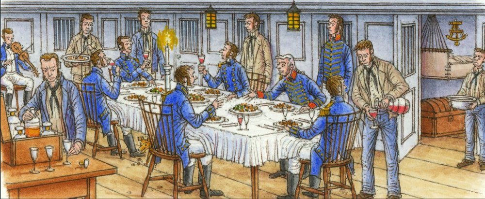 К илл. - Ужин в кают-компании. Второй справа за столом, в расшитом мундире - командир корабельной морской пехоты, за спиной у него - собственный ординарец. Матросы морпехов традиционно недолюбливали, так что он не доверяет стюардам наполнять свой бокал.
