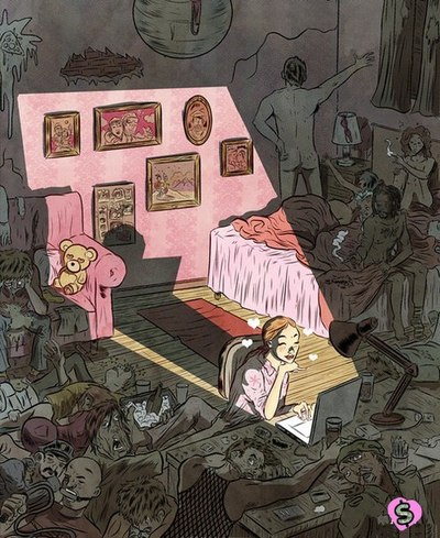 представляю, как в промежутка между сексом она начинает разматывать рулон обоев и крепит их на стену