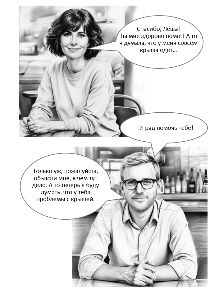 Примчался, Люба уже ждала меня за столиком. Что мы с ней ели — не помню, но поговорили мы с ней очень хорошо. Вспомнили студенческую жизнь, истории разные, жизнь в общаге, друзей, преподавателей...