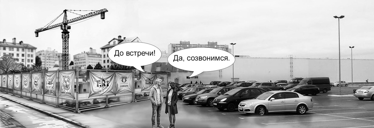 Мы вышли якобы покурить, и я увидел, что на том месте, где вроде как должно быть то самое желтоватое здание, расположен забор с рекламными баннерами, а за ним гудит стройка.