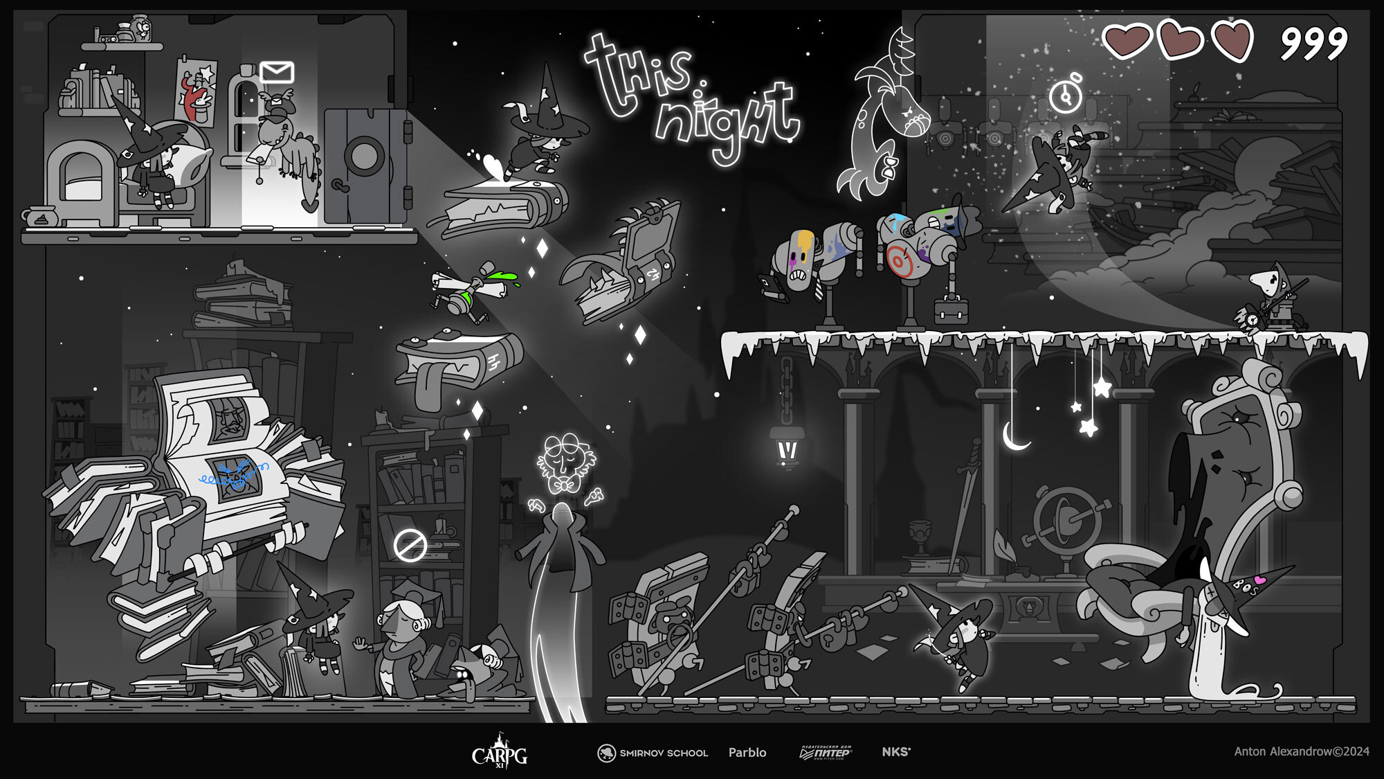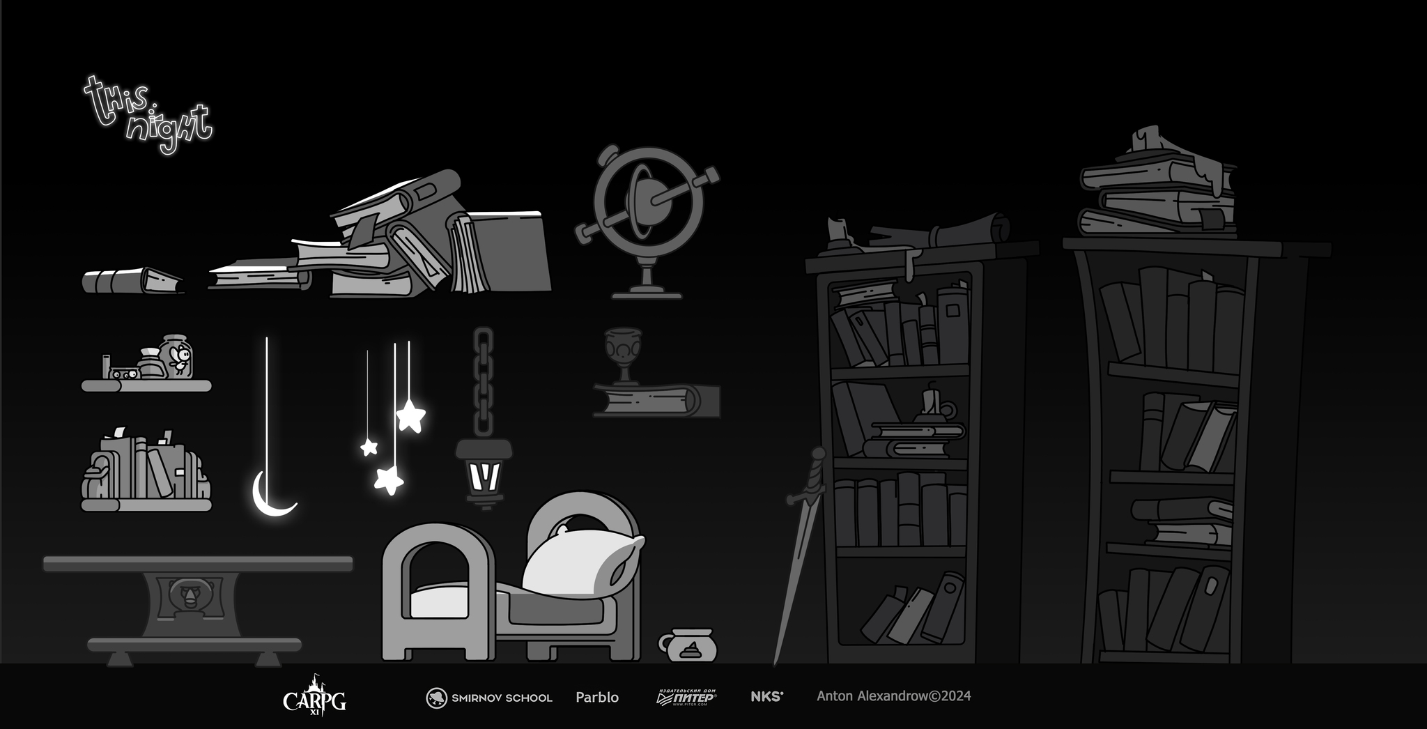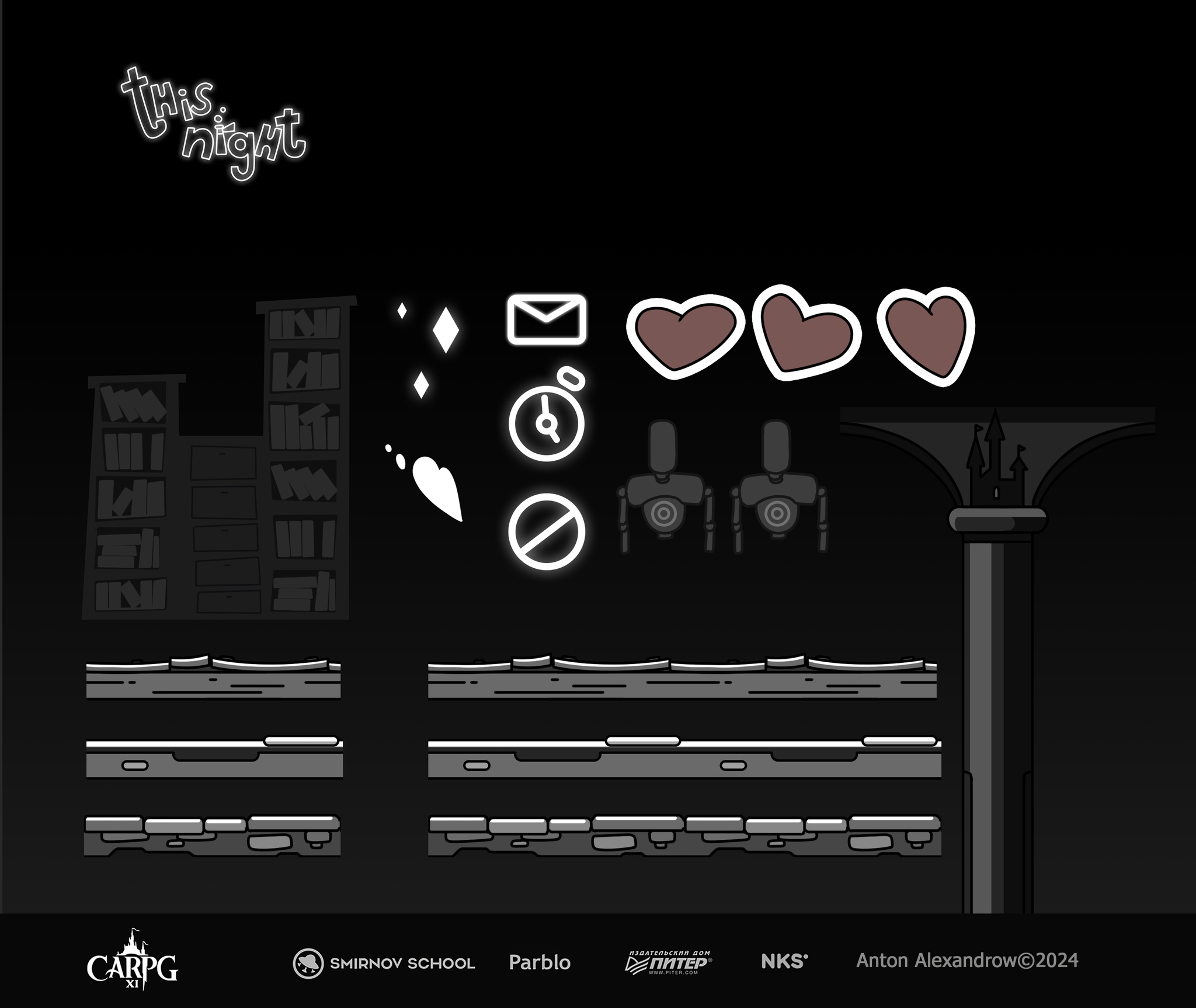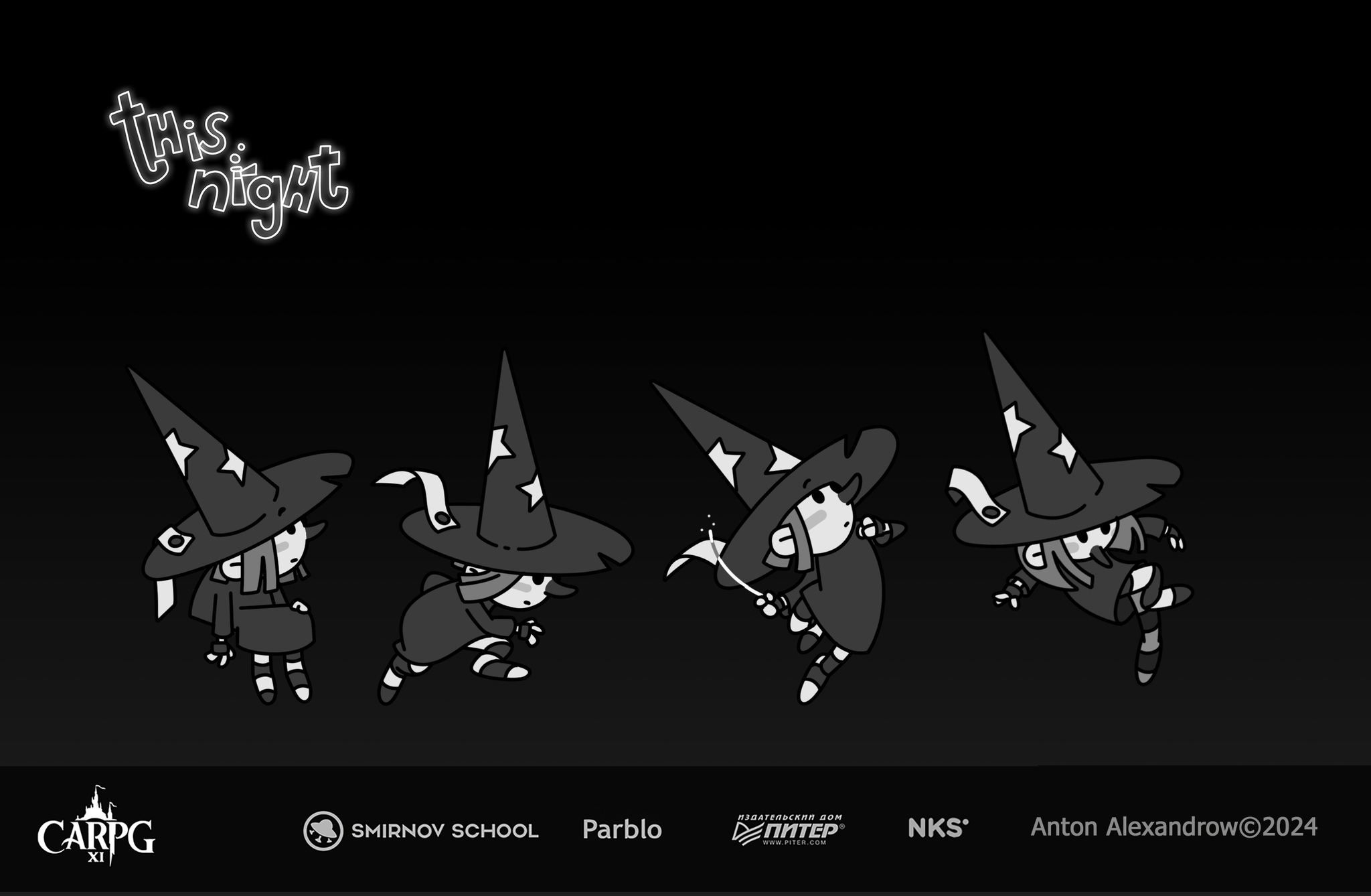 Свою игру я назвал «этой ночью". Именно с маленькой буквы. Что-то вроде классического «однажды давным-давно…». Кстати к логотипе названия одно из сюжетных событий - намек на сбежавшее зелье.