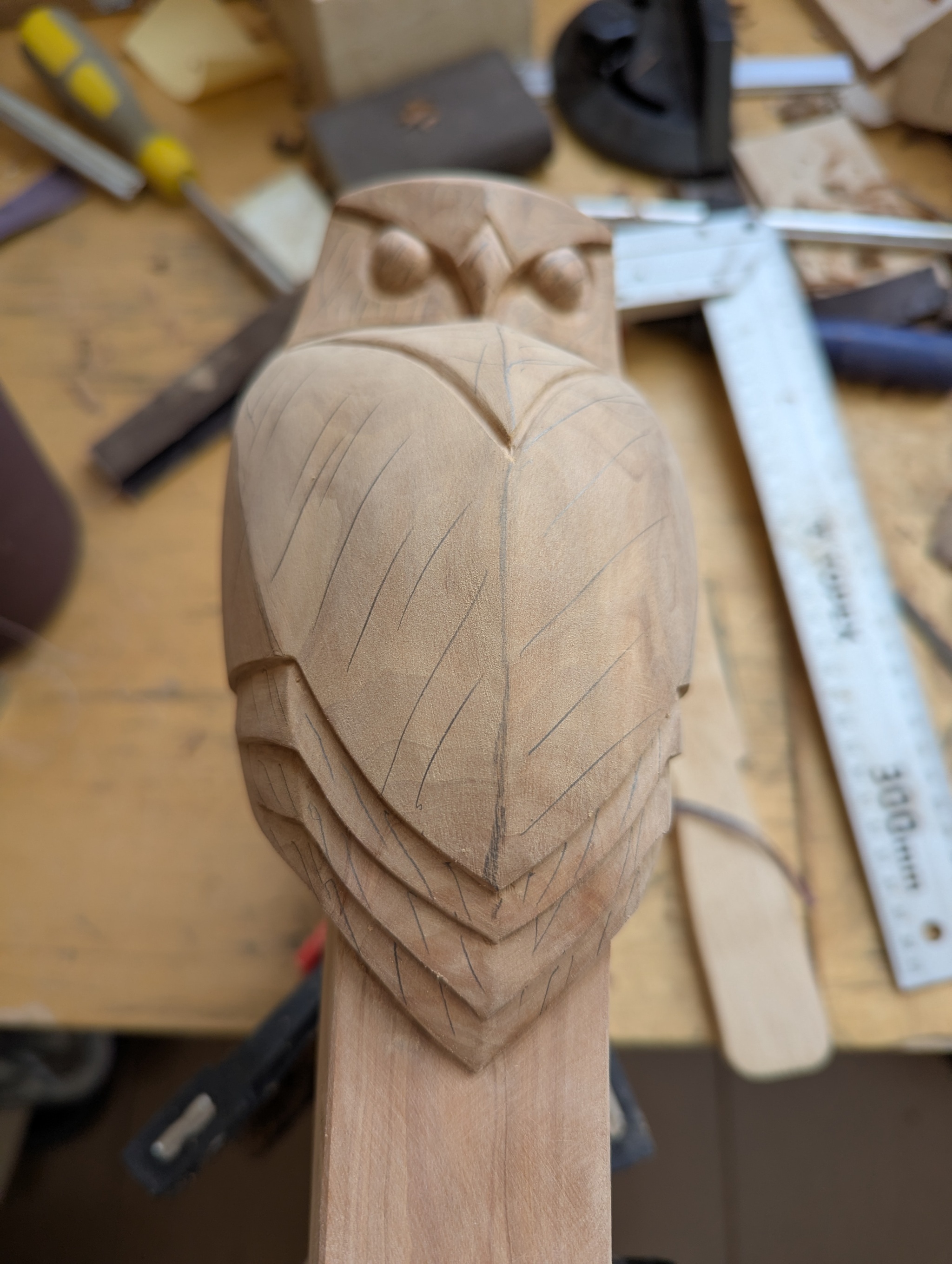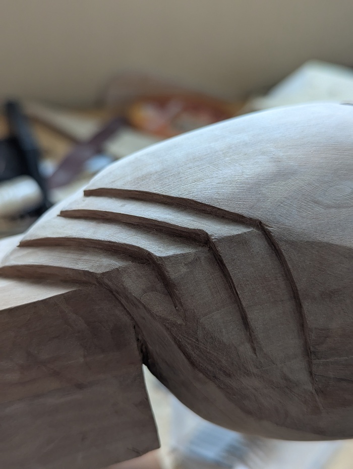 Тут главная фишка всей скульптуры в гранях, которые нужно было разметить с самого начала и не завалить в процессе. Дальше у меня опять провал в фотографировании процесса вышел, извините. Как я прорезал детали не осталось ничего. Потом уже начал, понемногу, шлифовать, подрезая детали по ходу.