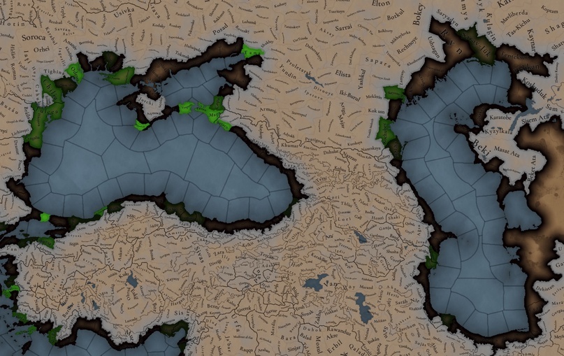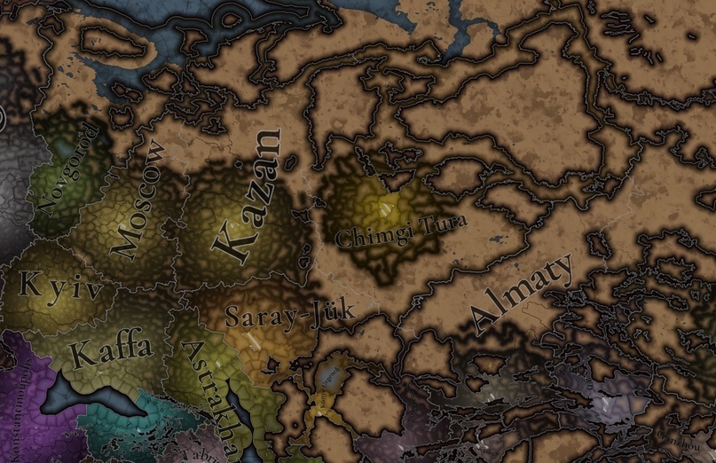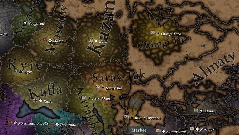 Рынки! Большой регион с множеством рынков, хотя вы, возможно, заметили, что мы изменили цвет локаций, которые имеют 0% доступа к рынку, что имеет место быть в некоторых регионах. В любом случае рыночными центрами являются Каффа, Астрахань, Сарай-Жук, Куня-Ургенч, Самарканд, Алматы и Чимги-Тура. Кстати, эти названия гораздо легче заметить в пользовательском интерфейсе игры, поскольку они находятся рядом с рыночными центрами: