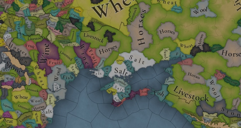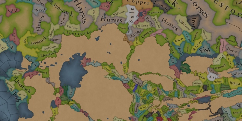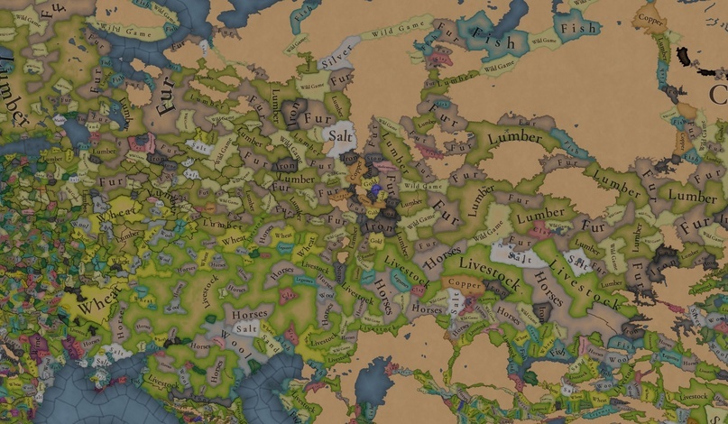 Что касается сырья, то в Степях вполне логично много скота и лошадей, хотя есть регионы и с некоторыми другими товарами. А на севере основными материалами являются древесина и мех. Кроме того, я хочу упомянуть минеральный центр в Уральских горах, где много меди, железа, золота, свинца и угля. Это делает его очень интересным местом в середине и конце игры, и, играя за Московию/Россию, я скажу вам, что вы определенно захотите расшириться в этот регион, поскольку к тому времени он удовлетворит некоторые из ваших материальных потребностей.