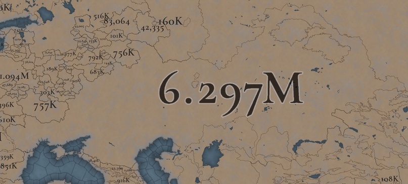 На этой неделе мы показываем только режим карты населения страны, так как здесь и там есть некоторые номера локаций, которые не работают из-за уже известной проблемы с нашим PoP-редактором (и которые находятся на пути к исправлению). В любом случае, общая численность населения региона составляет около 6,5-7 млн человек, из которых около 6,3 млн человек входят в состав Золотой Орды. Как я уже сказал, это опасная страна…
