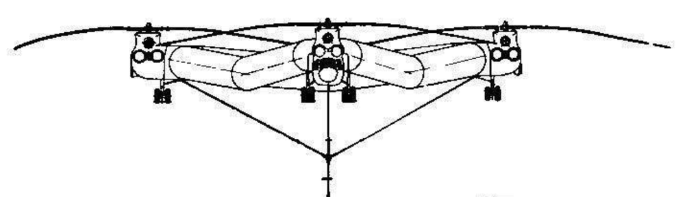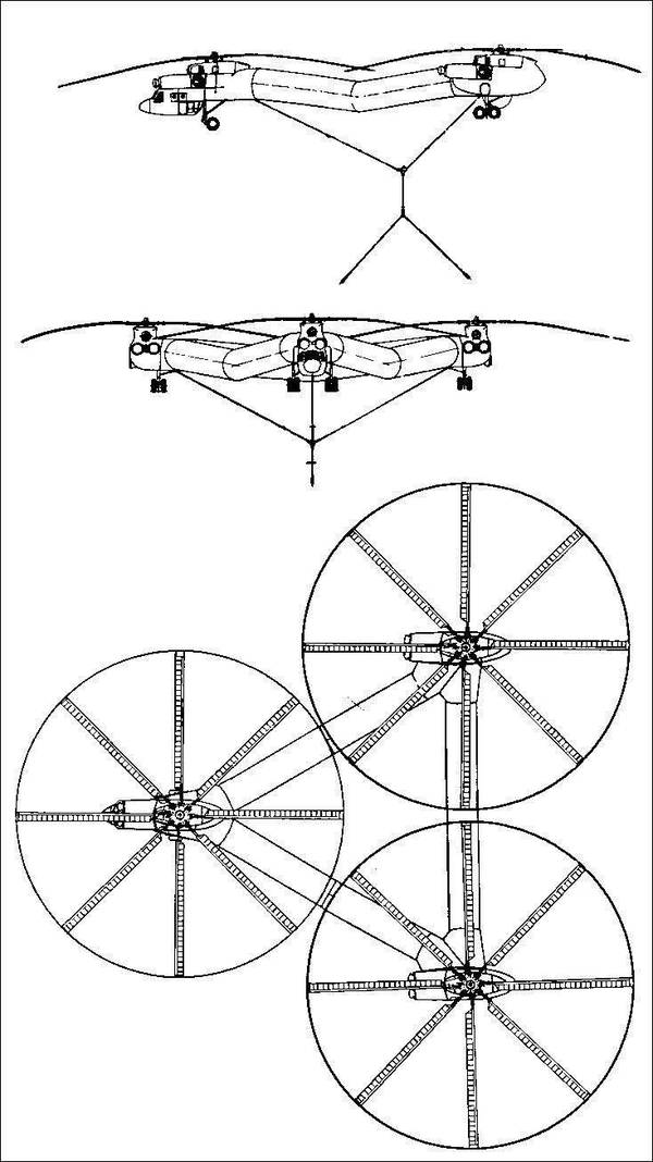 Прорабатывались две схемы соединения гондол фюзеляжа: "звезда", при которой балки от каждой гондолы сходятся в одной точке в центре треугольника (по схеме фирменного знака фирмы «Мерседес»), и "треугольник", когда балки образуют стороны равностороннего треугольника. Выбор был сделан в пользу "треугольника". Чтобы снизить потери от вредного влияния несущих винтов, одну гондолу расположили спереди и две гондолы - сзади.
