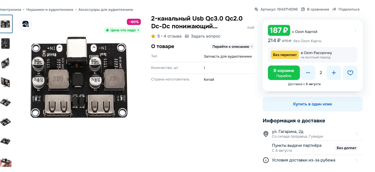 Заказал 2 штуки. Нужны именно такие, так как, при питании в 12В на выходе выдают всевозможные варианты стандартов заряда по USB. Нужно это для подключения к ИБП с выходом 12В всяких устройств из умного дома, типа, колонки, IR-передатчика, Zeegbe-шлюза и т.д. Плюс у них удобство в том, что можно масштабировать, то есть спаять между собой и использовать только один вход по питанию. Я понимал, что доставка из Китая долгая, но был согласен, так как только через месяц мне должны были провести на дачу нормальный интернет и всё это делалось под это событие.