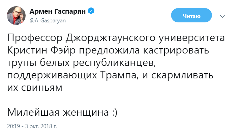 401 Hohol2 Професссура. 7 лет назад https://twitter.com/a_gasparyan/status/1047687587488567296 США Мнение Политика Скриншот X (Twitter) Армен Гаспарян