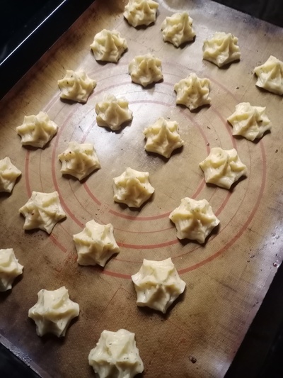 Хорошенько размешали тесто – и в корнет. Очень рекомендую завести в хозяйстве подобную гладкую насадку для него, мне муж напечатал на 3D-принтере, очень выручает: с обычной моей большой насадкой для крема тесто застревает (неоднородоное), а совсем без насадки трудно отсадить ровно, получаются кракозябры. Впрочем, если у вас совсем нет никаких насадок, это фигня, просто берите две мокрые чайные ложки и ими отсаживайте такие плевочки размером с грецкий орех.