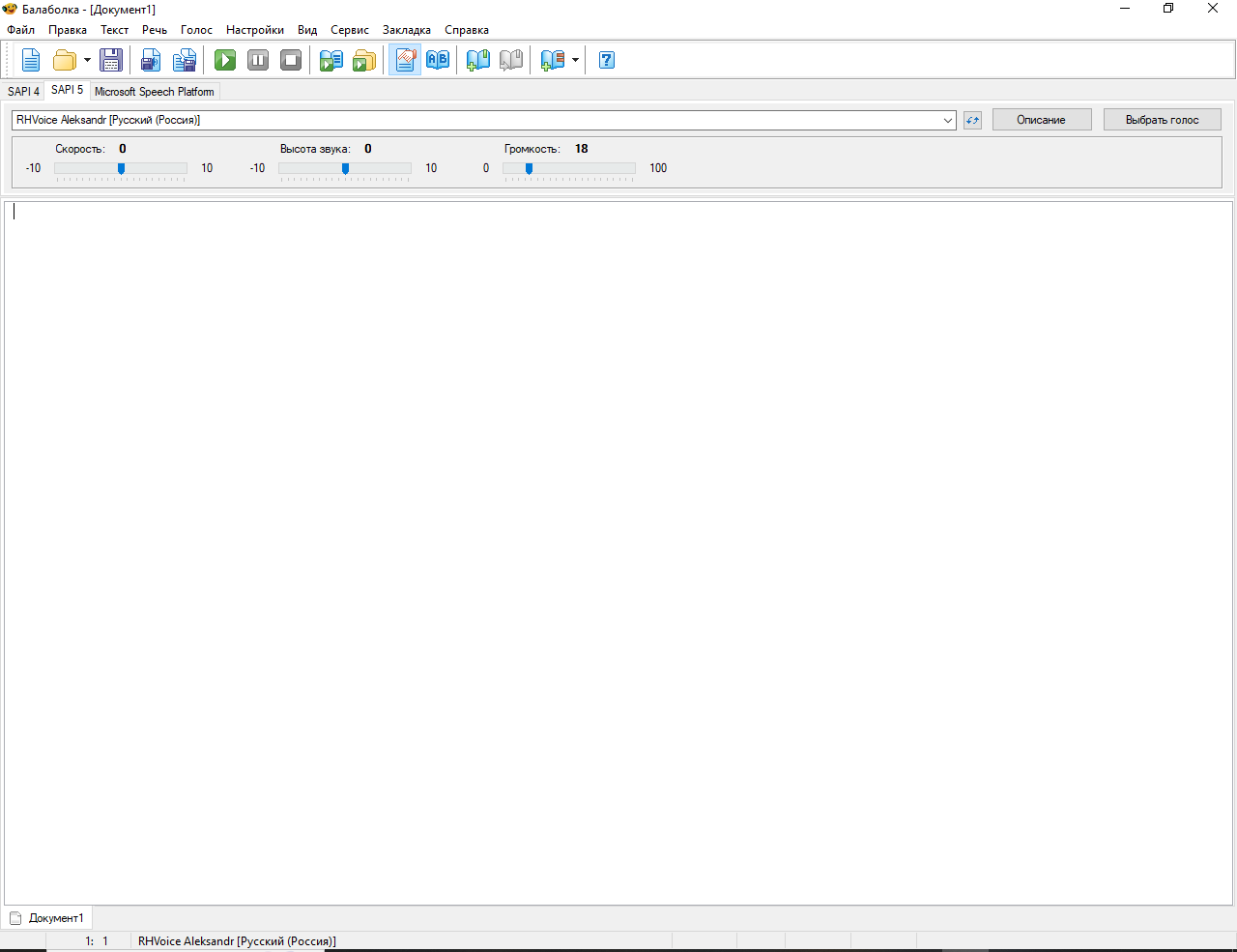 Вы печатаете/вставляете текст и нажимаете зелёную кнопку "Плей". Вроде бы всё, НО программа использует только установленные у вас на компьютере модели голосов, а их качество, мягко говоря, говно (и ваши уши явно не этого ждут).