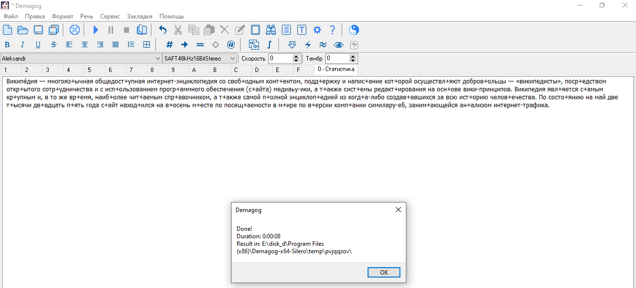 Далее в последний раз нажимаем на "Ок" и ждём, пока программа всё озвучит и выдаст сообщение об окончании:
