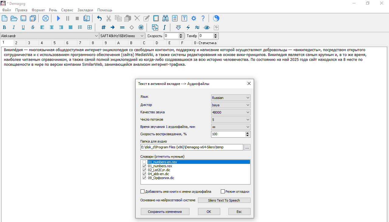Вы выберите нужный вам язык и голос, но что же это за "Словари"? Всё очень просто. Чтобы текст был озвучен хорошо, его нужно подготовить к прочтению. Каждый словарь изменит текст, соответствуя своему названию. Лучше всего использовать словарь с цифрами. Так как модели голосов (как бы это ни было смешно) не могут прочитать именно цифры, если они как символ, ну там 1, 2, 3 и так далее. Поэтому цифры прописывают словами: "1" → "один" и так далее.