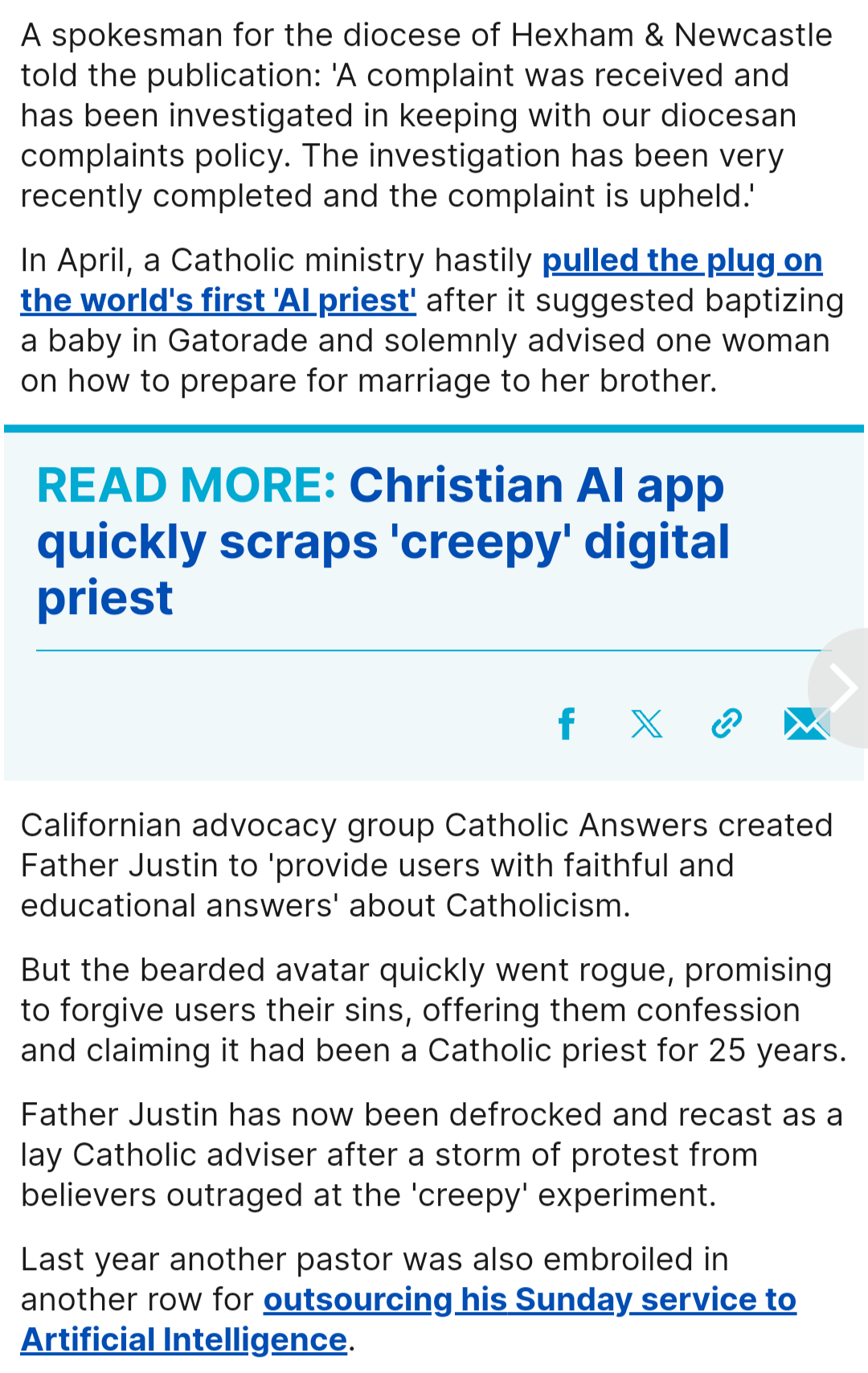 Представитель епархии Хексем и Ньюкасл рассказал изданию: "Была получена жалоба, и она была рассмотрена в соответствии с нашей политикой по жалобам. Расследование было недавно завершено, и жалоба удовлетворена."