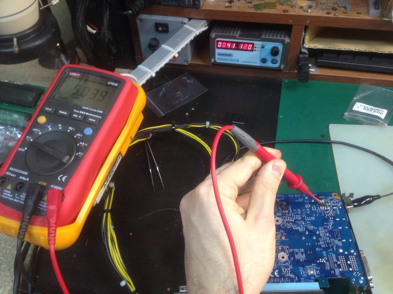 Проблема обнаружилась сразу же при визуальном осмотре видеокарты - сбит smd конденсатор возле разъёма PCI-e. Устанавливаю его на место и заливаю лаком место повреждения.