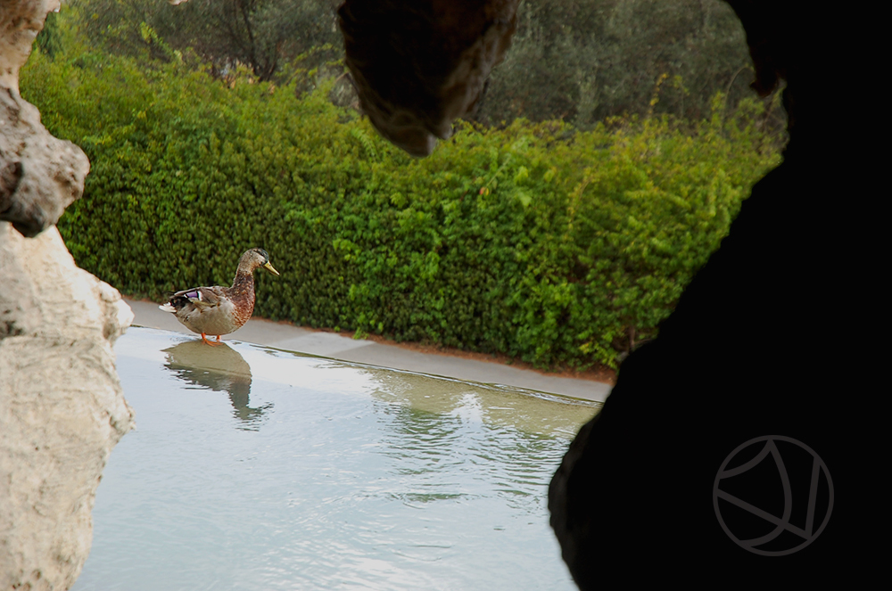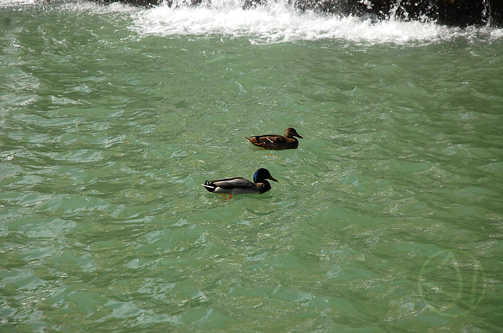 Исследовав грот, можно наконец спуститься на смотровую площадку. Для каждой созерцающей души и готовой для съёмки камеры там найдётся своя зацепка: стаи уток и селезней, усердно сопротивляющихся потоку воды, сам поток, тянущий поиграться с настройками экспозиции, деревянный дом, вырубленные из камня перила и, конечно, вид.