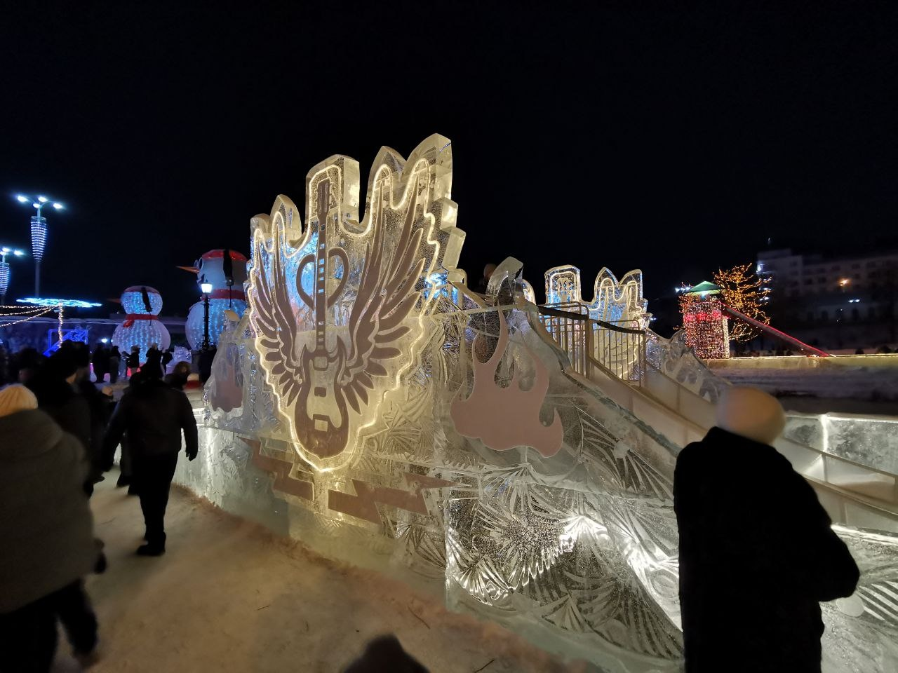Сразу после входа установлены ледовые скульптуры на тему «рокового направления». Вообще вся тематика городка (увидите далее) будет таковой. Ведь в этом году отмечается сорокалетие Свердловского рок-клуба.